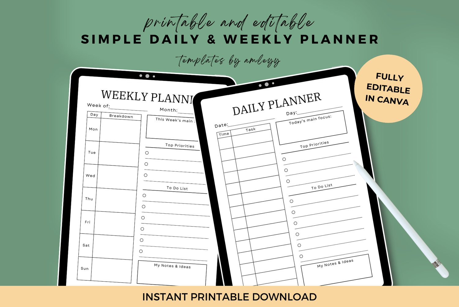 Simple Daily and Weekly Planner Template | Minimalist Canva Planner | Printable Productivity Organizer | Editable Planner | Digital Download