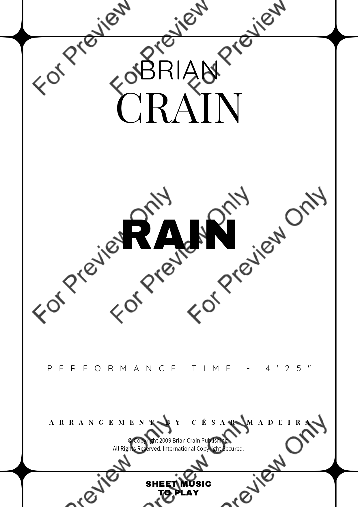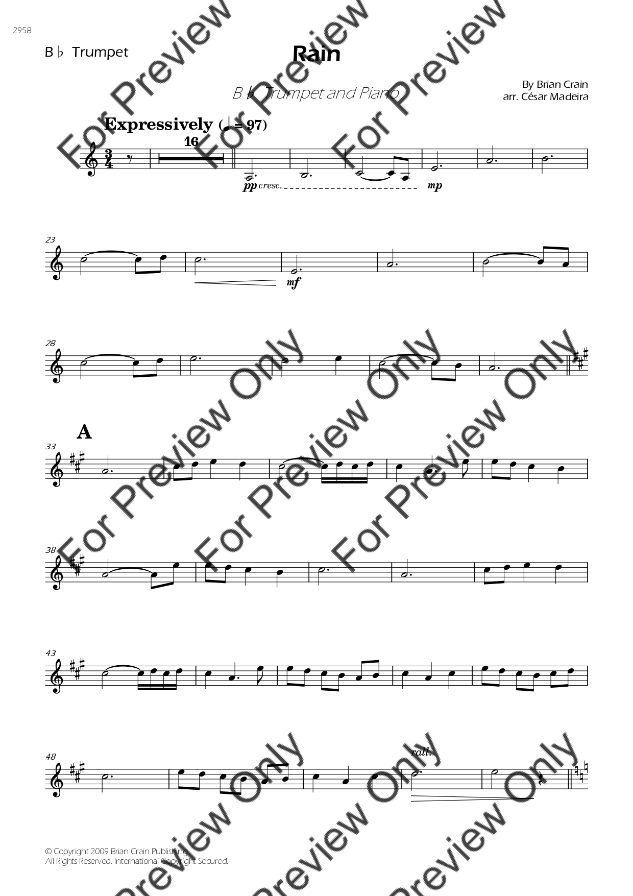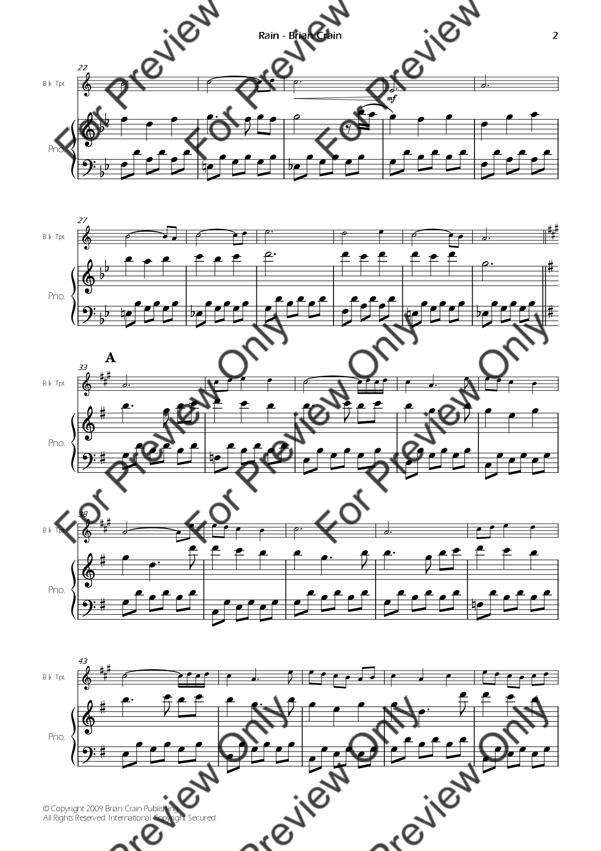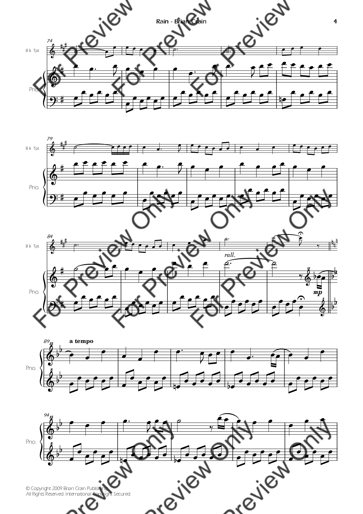 Rain by Brian Crain. Arrangement for Bb Trumpet and Piano. With Full Score and Individual Parts. Have fun!