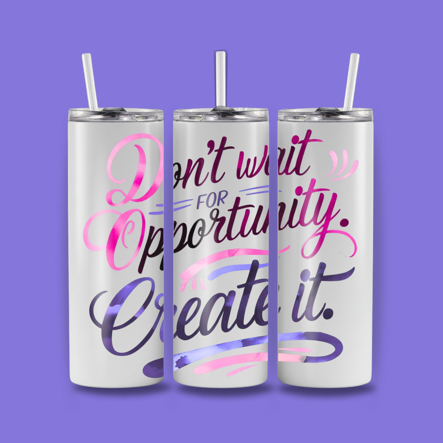 20 oz Motivational Skinny Tumbler – “Don’t Wait for Opportunity. Create It.”