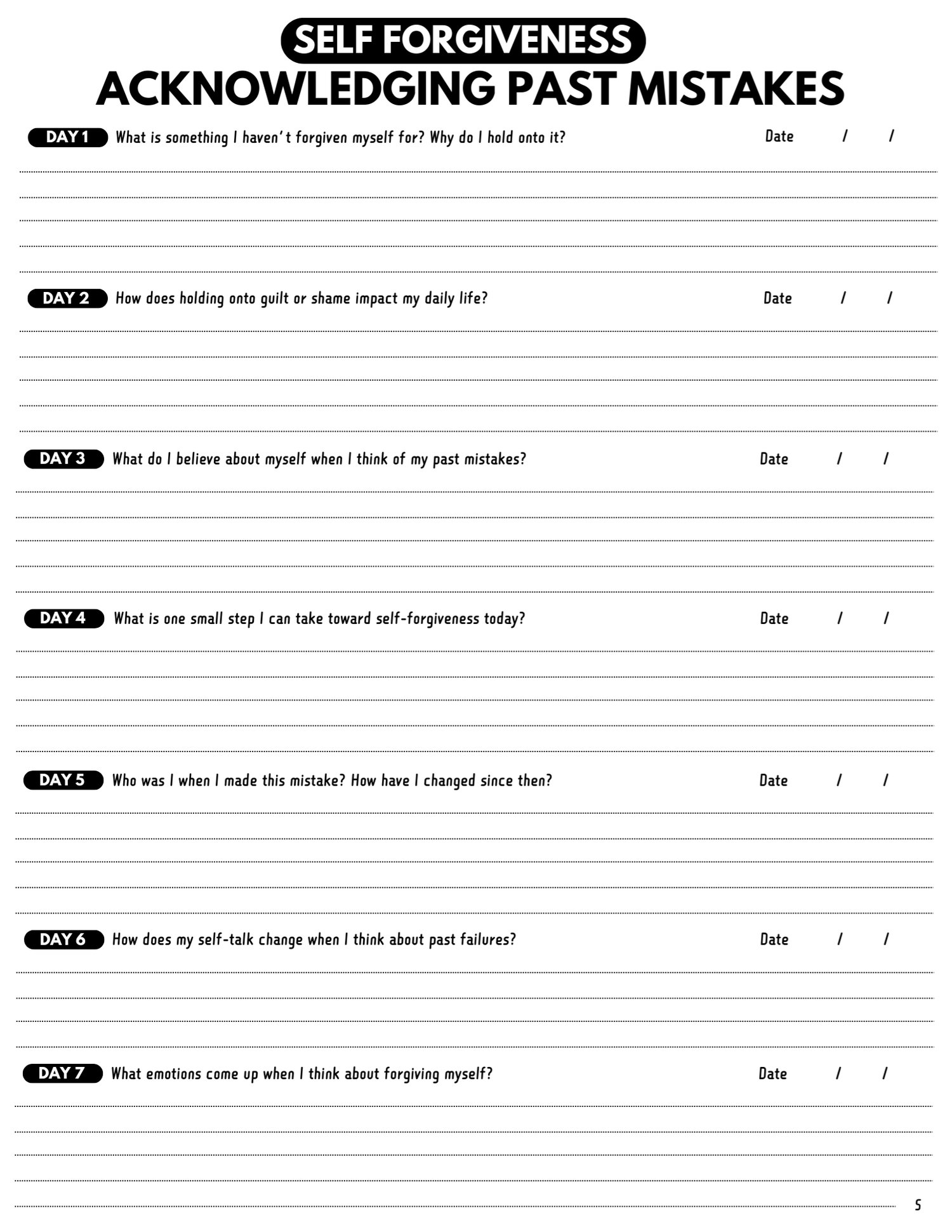 The Self-Forgiveness Journal guides you through a compassionate journey of letting go, making peace with your mistakes, and moving forward with a lighter heart.