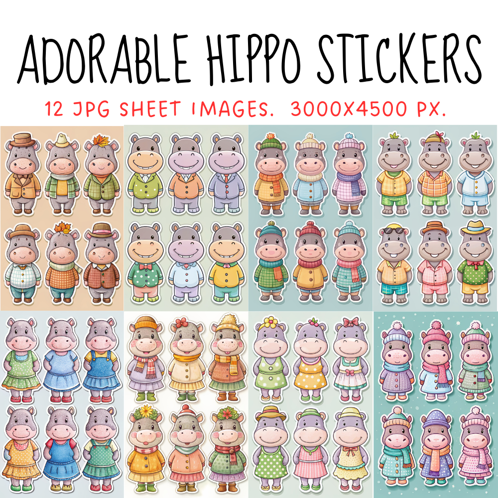 This digital product includes 12 Stickers Sheets (Each Sheet contains 6 stickers) of Adorable Hippo in JPG format, 3000x4500 px size.
