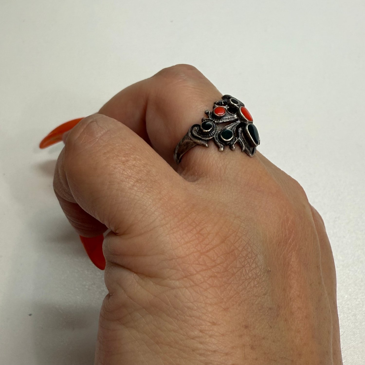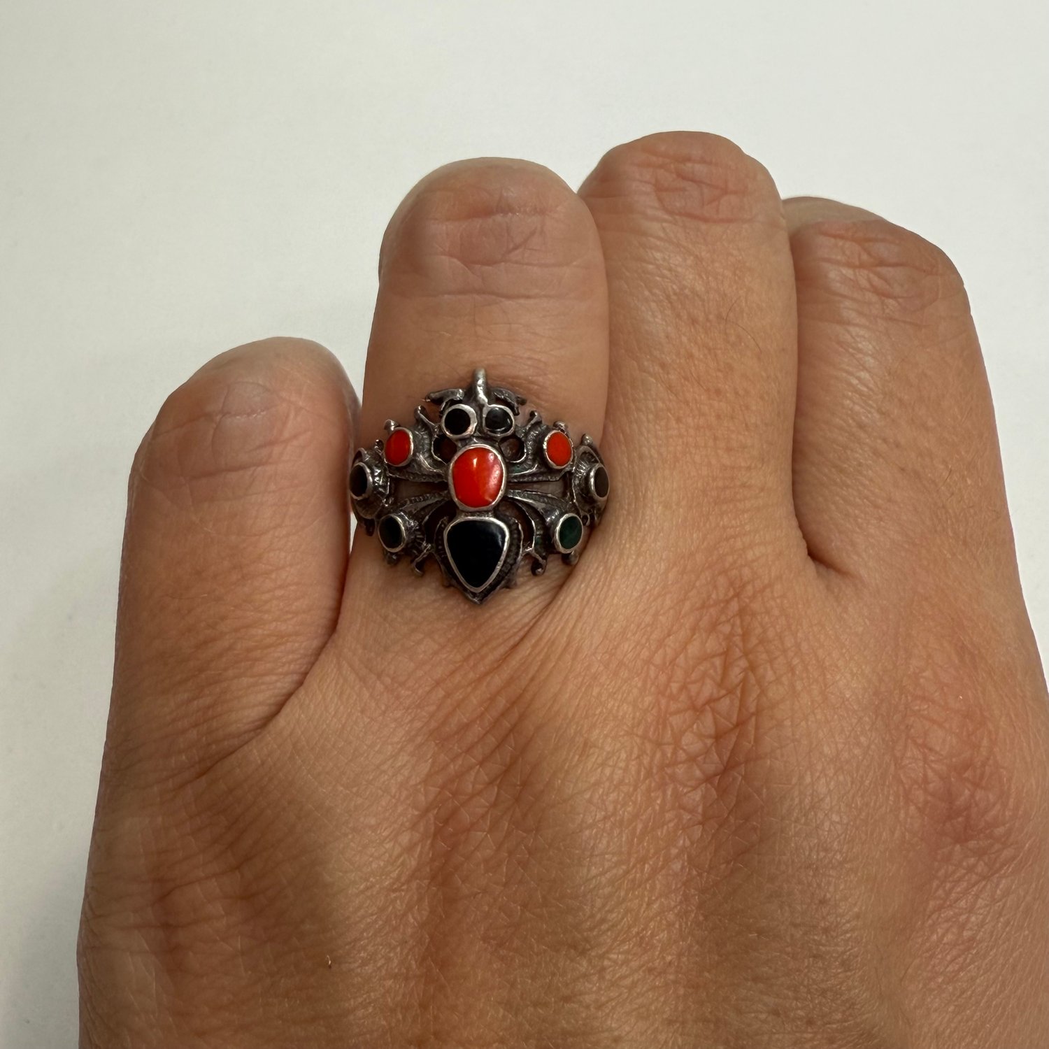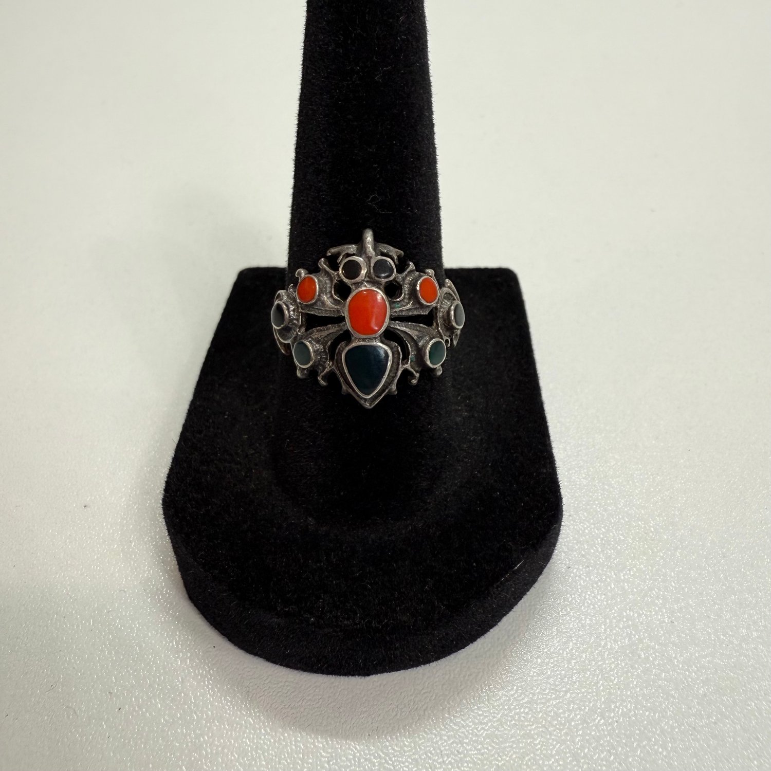 Sterling silver, Coral, black Onyx and green Onyx spider ring.