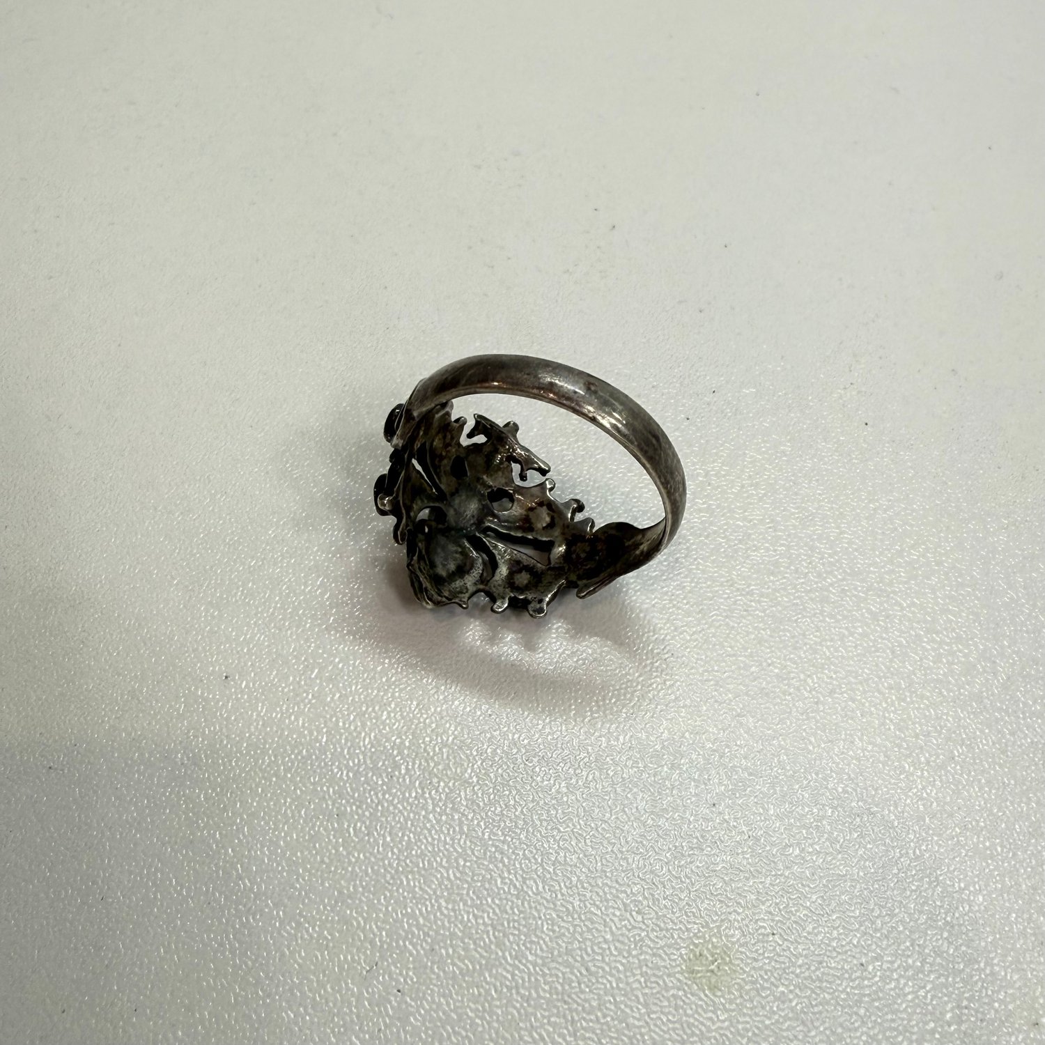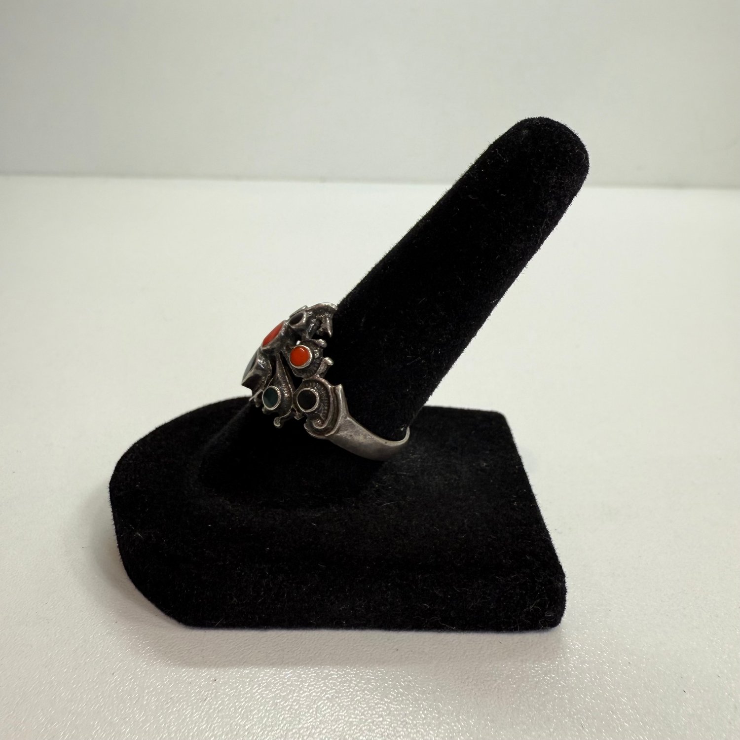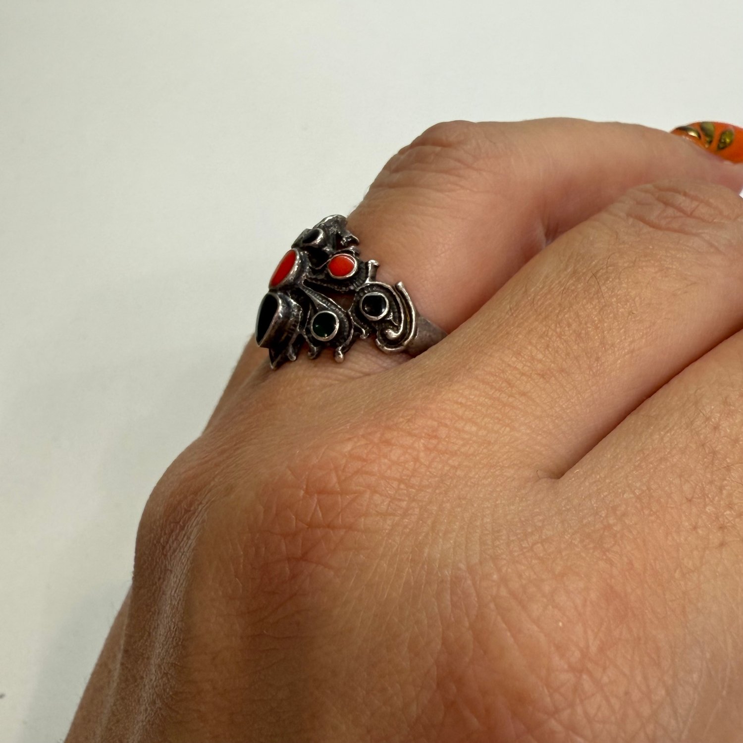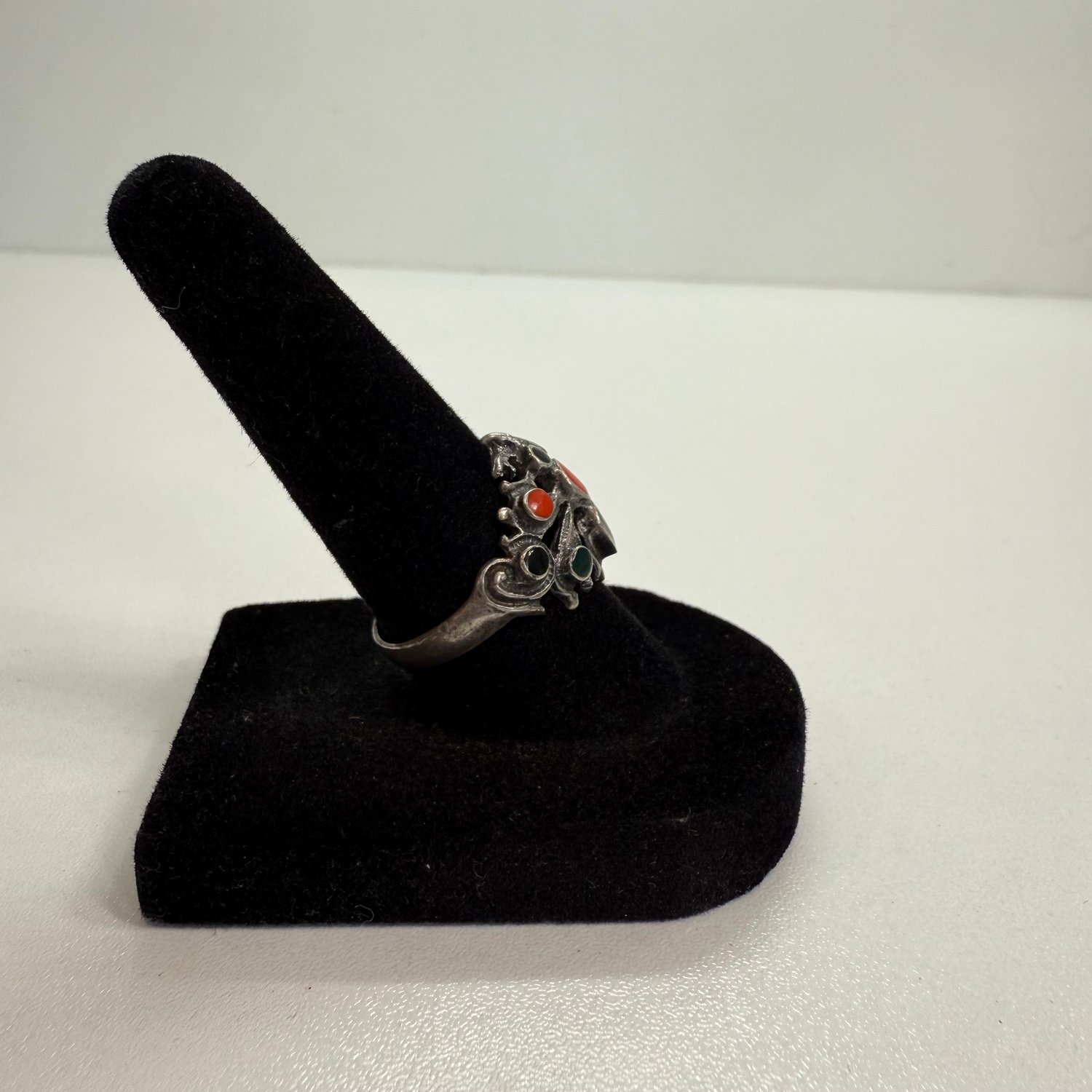 Sterling silver, Coral, black Onyx and green Onyx spider ring.