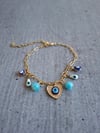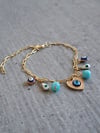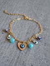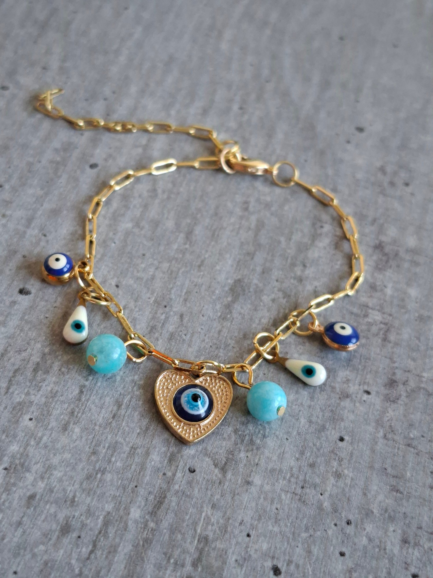 • Charms dorés : cœur central avec œil, gouttes et perles protectrices bleues