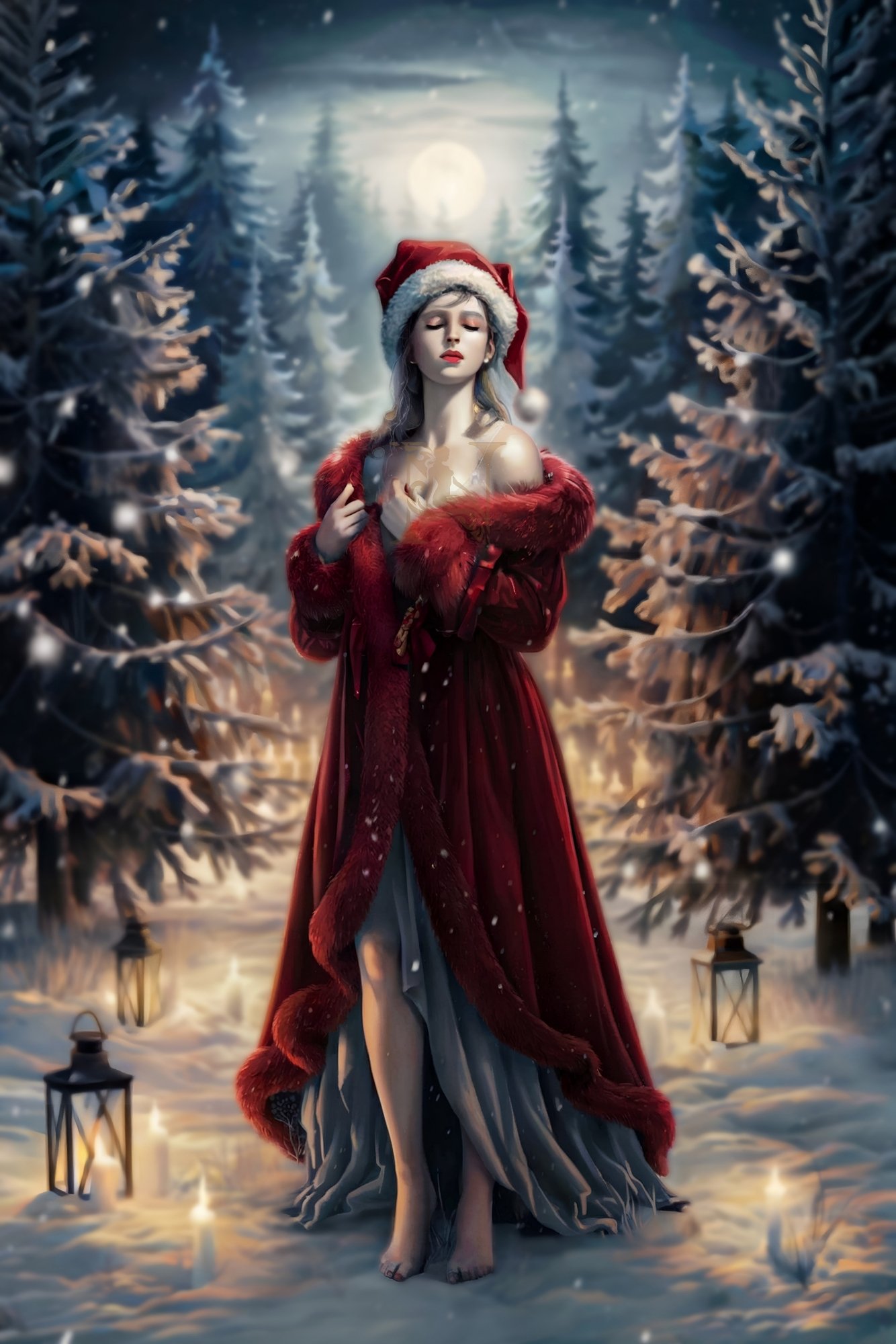 A stylized digital painting of a woman kneeling in a snowy pine forest under a glowing full moon. She wears a red Santa hat, red velvet coat draped over her shoulders, and red lingerie, evoking both festive warmth and emotional vulnerability. Lit lanterns and candles surround her, casting soft golden light onto the snow-covered ground. The pine trees shimmer with frost, and the atmosphere blends fantasy, sensuality, and sacred solitude. This artwork captures the tension between warmth and cold, celebration and introspection—perfect for holiday-themed visual storytelling.