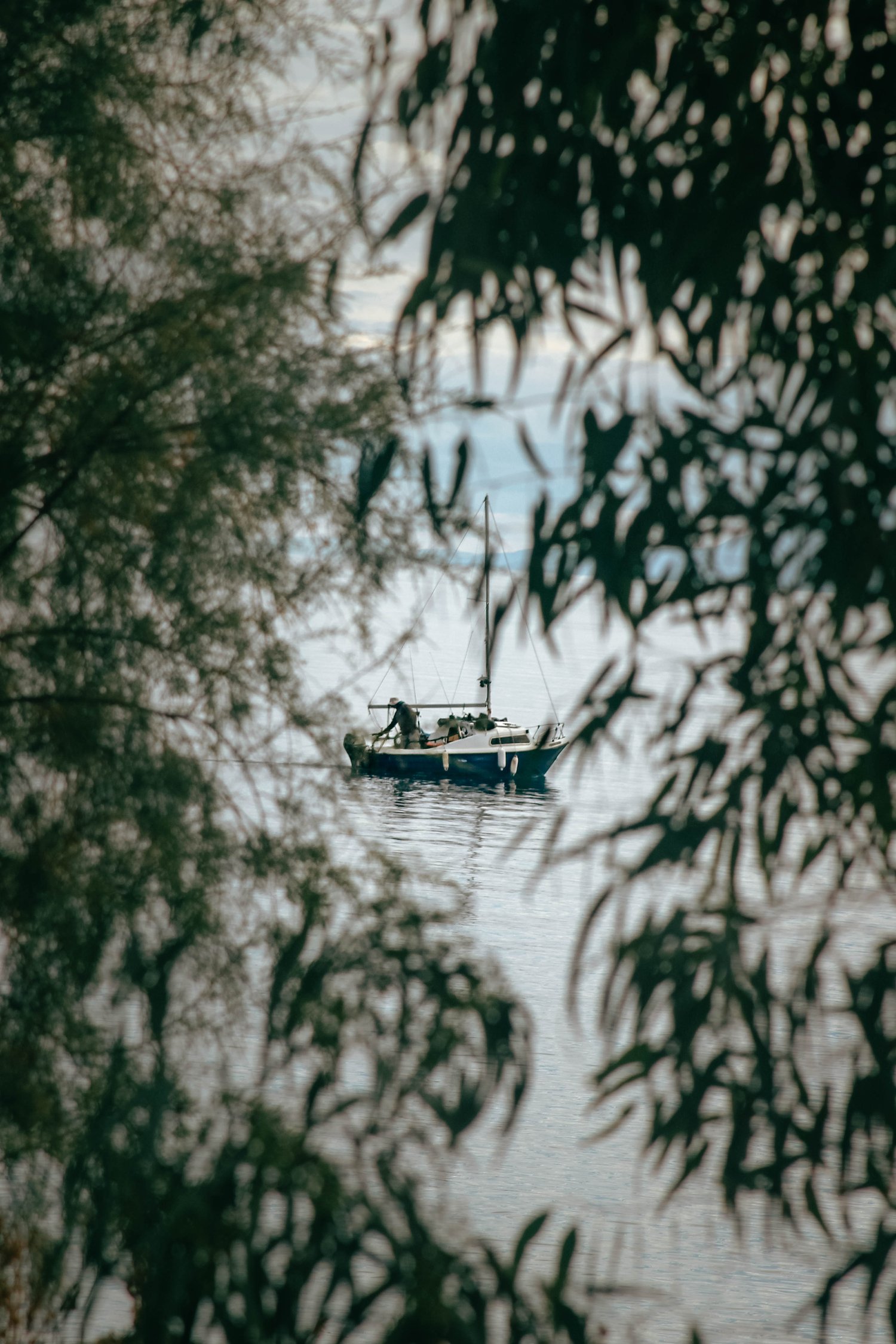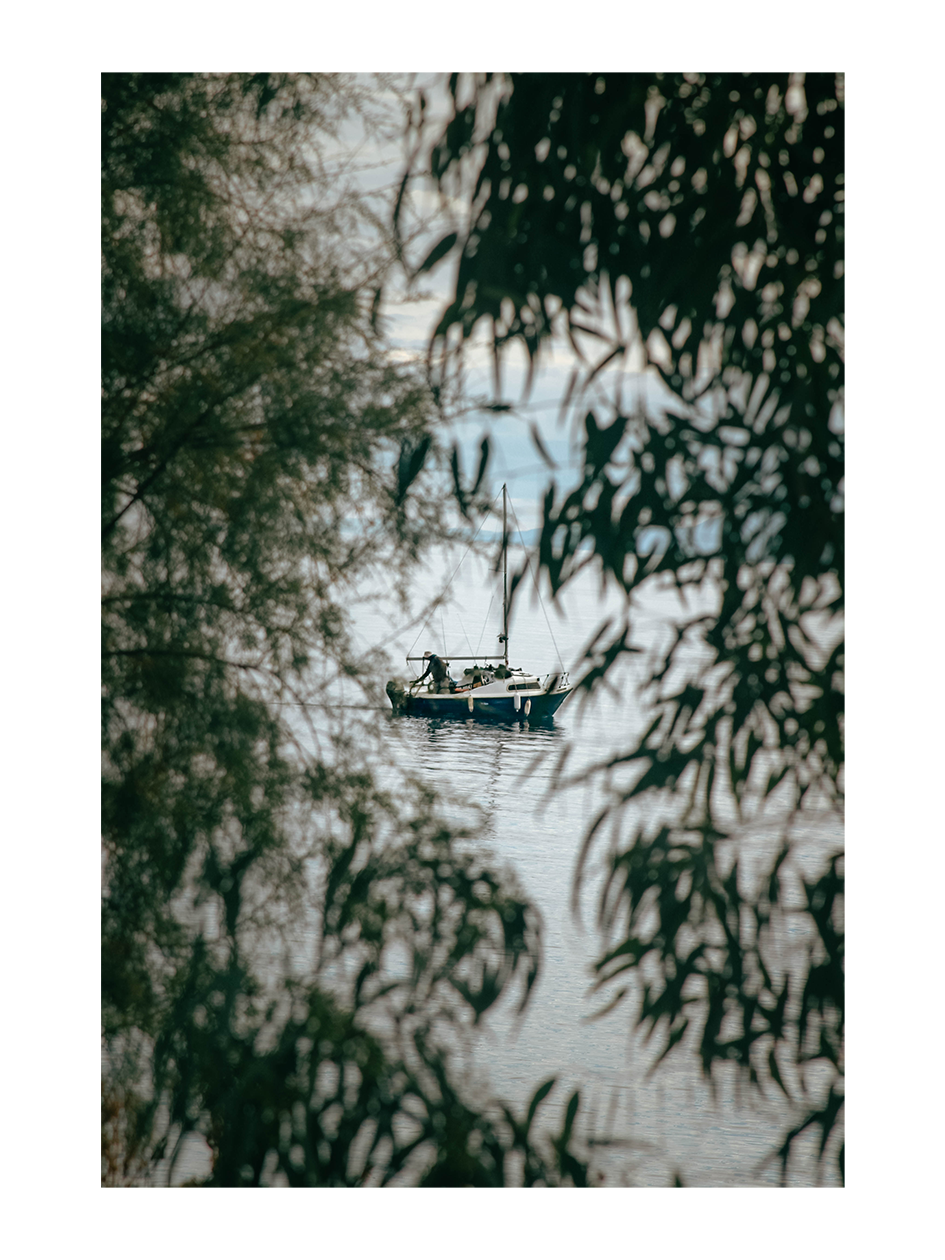 Cette photo a été prise dans le sud-ouest de la Grèce, alors que je traversais les routes côtières menant au Péloponnèse. Après plusieurs heures de route bordée par la mer, j’ai marqué une pause. C’est à ce moment-là que mon regard a été attiré par ce petit voilier de pêche, posé au centre de la scène, presque dissimulé derrière des feuillages agités par le vent.