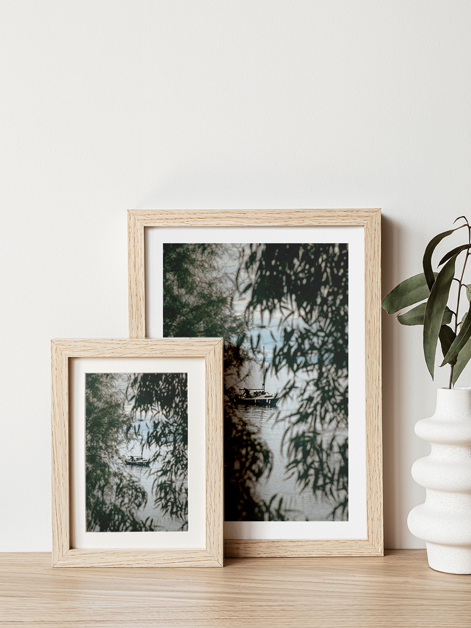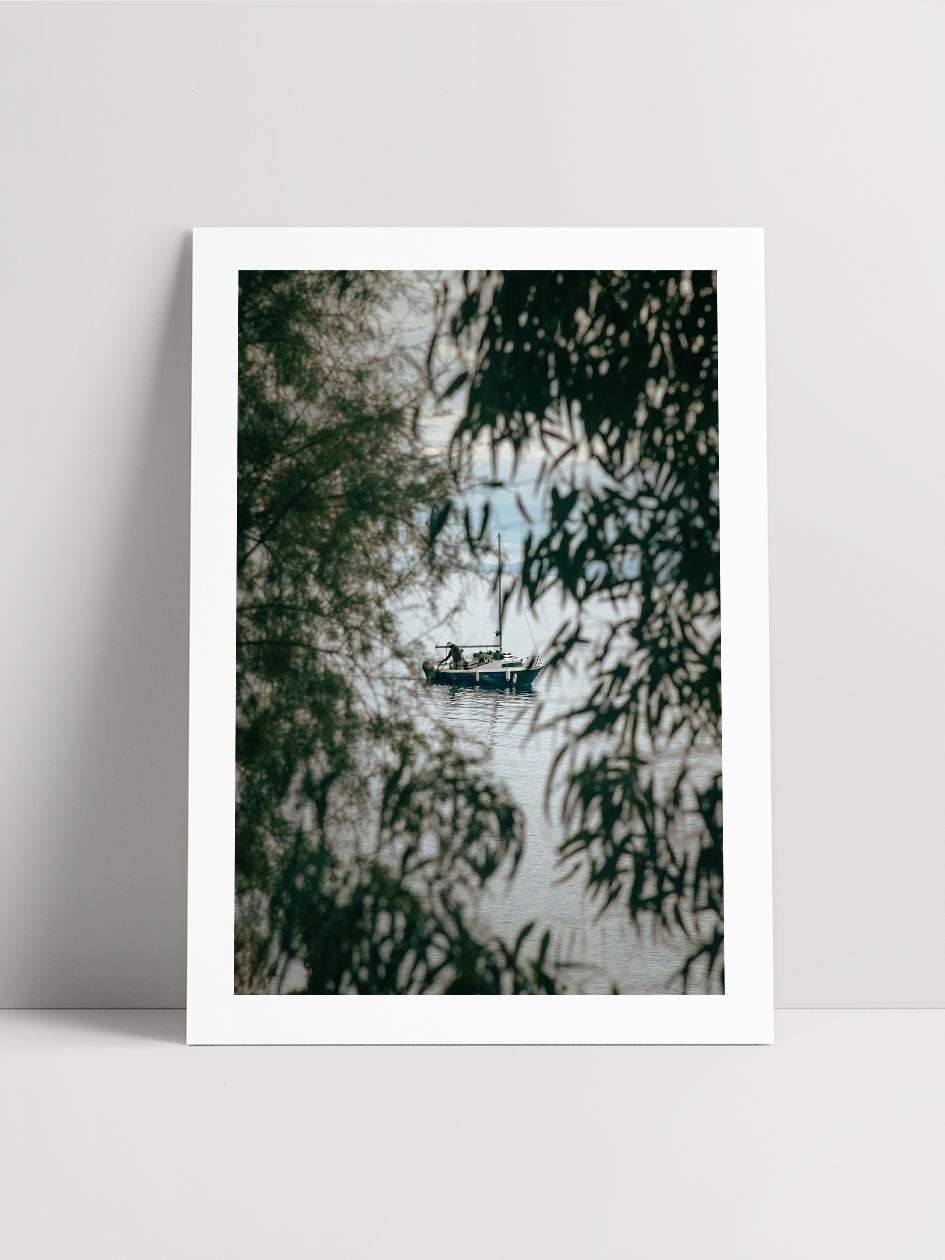 J’ai pris le temps d’observer avant de photographier. Puis j’ai choisi ce cadrage à travers les branches, comme si je regardais la scène discrètement, sans la perturber. Les feuillages sombres encadrent le bateau, contrastent avec le bleu calme de la mer et du ciel, et donnent à cette image une dimension presque intime, protégée.