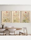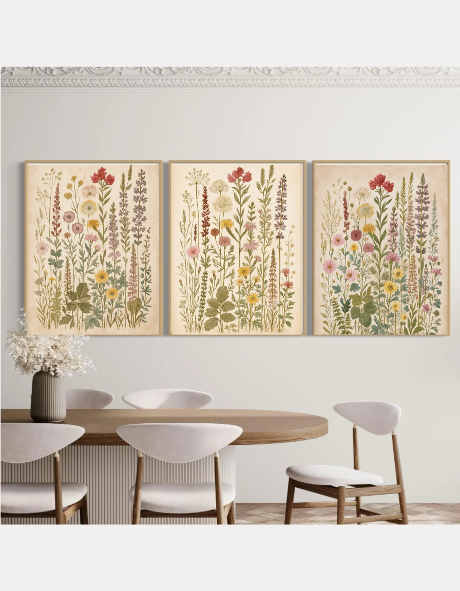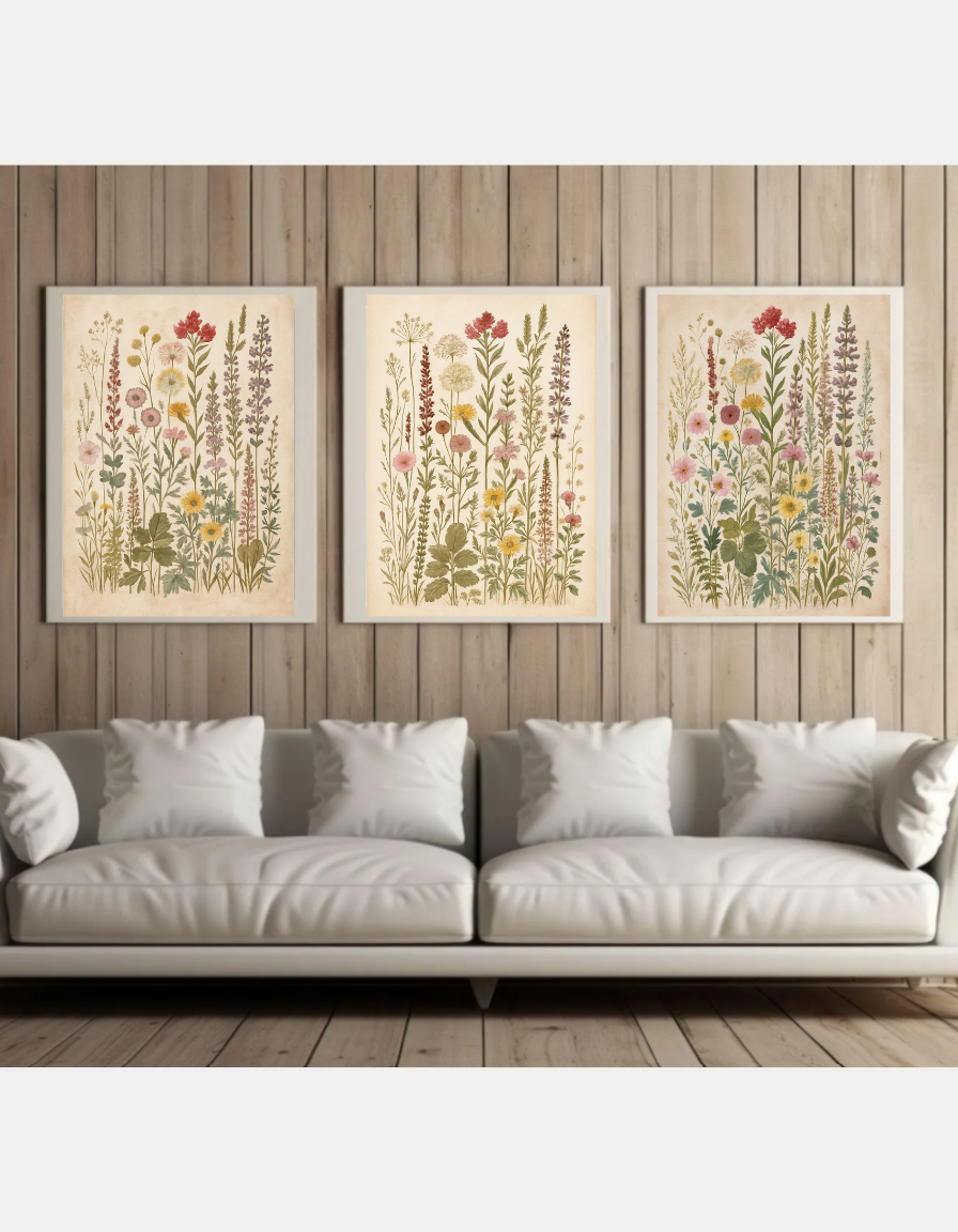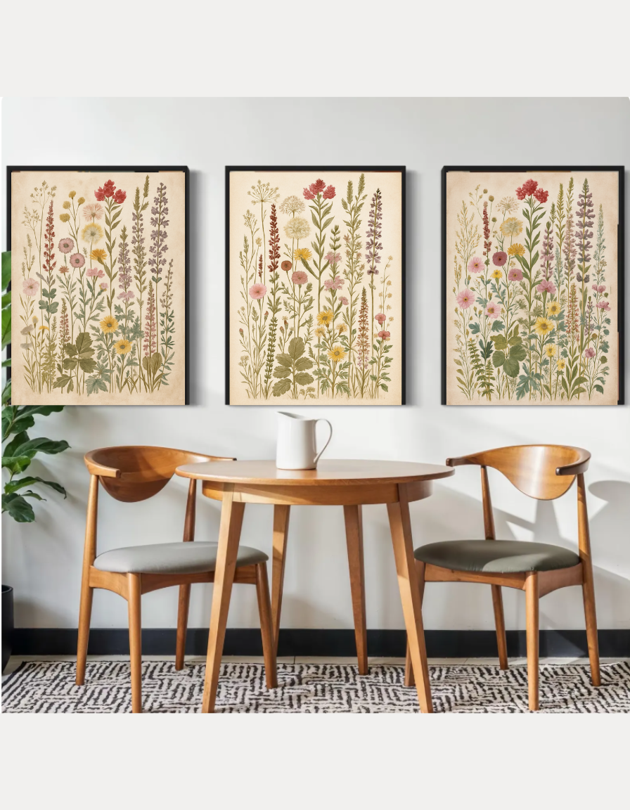 Elevate your home decor with this quirky vintage floral wall art printable set of 3 PNG files, perfect for adding a touch of retro charm to any space. Each high-resolution 300 DPI digital download features intricate botanical illustrations of wildflowers, stems, and leaves in a whimsical vintage style that's ideal for cottagecore enthusiasts or anyone seeking unique flower decor.