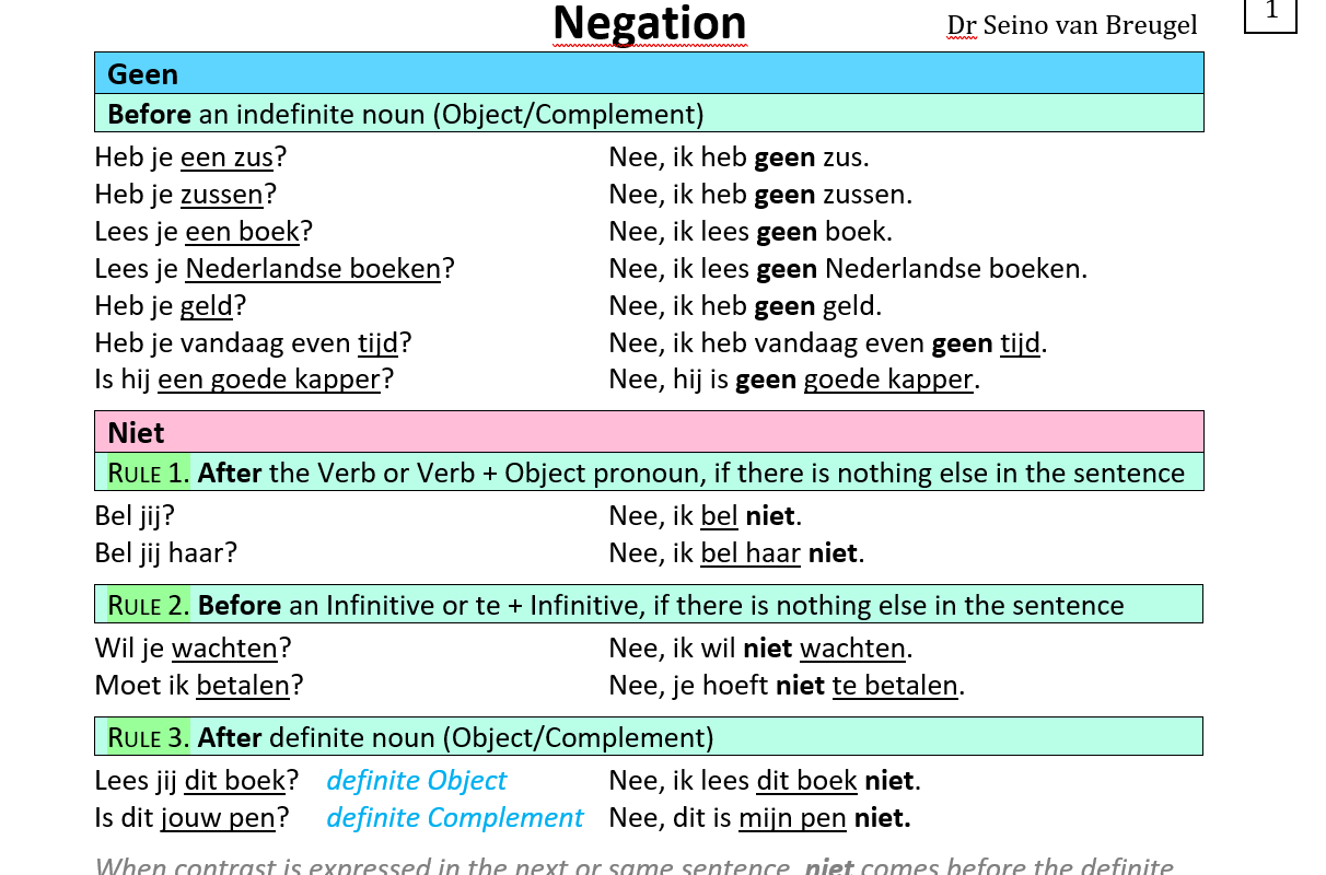 Negation in Dutch - Grammar Sheet - Negatie