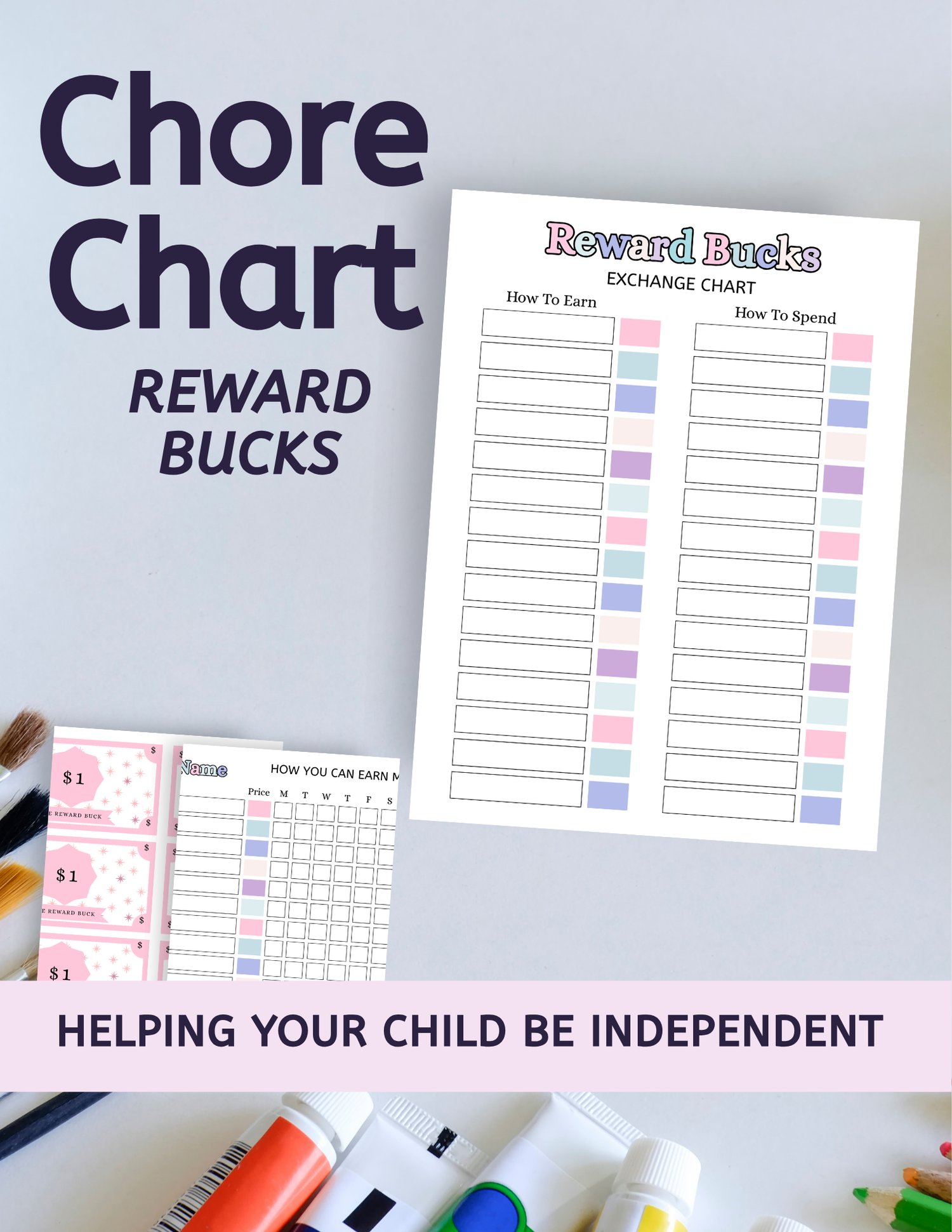 This printable pack includes a reward exchange chart, a weekly chore tracker, and multiple pages of printable reward bucks designed to support independence and positive routines at home.