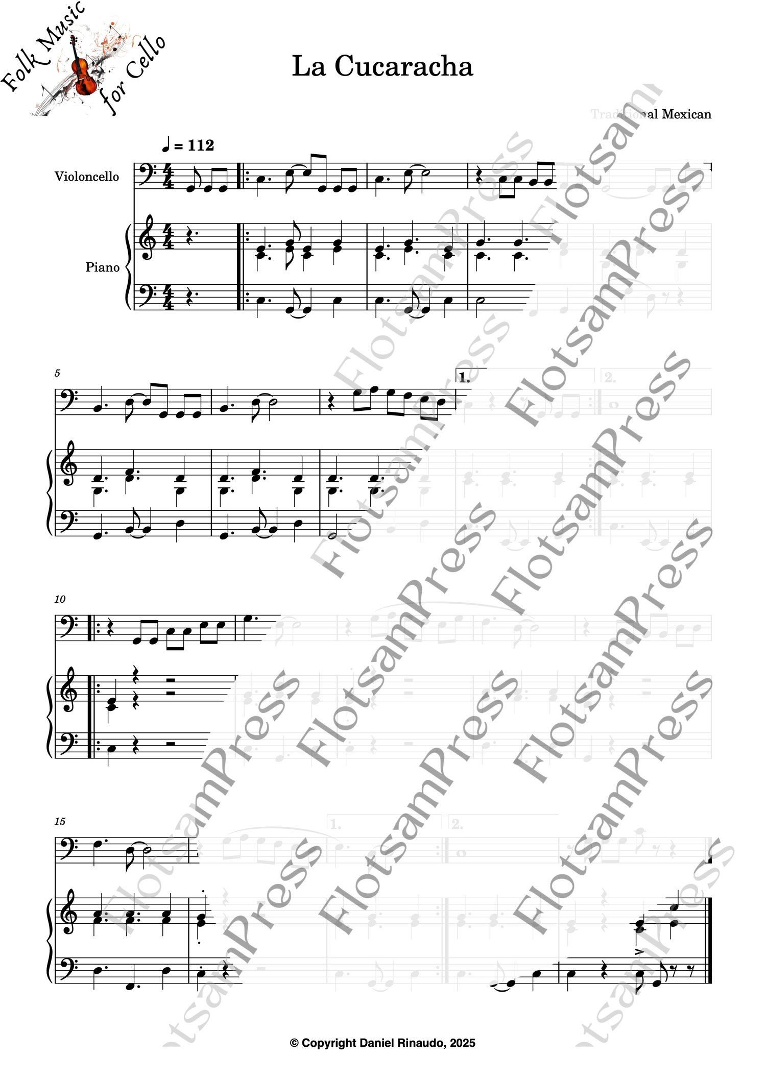 This arrangement of La Cucaracha is written for beginner to lower-intermediate cello players, with a simple and supportive piano accompaniment. Perfect for church services, lessons, or home practice.