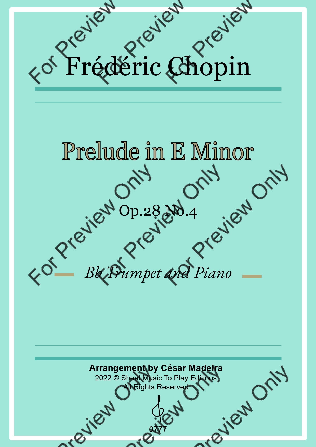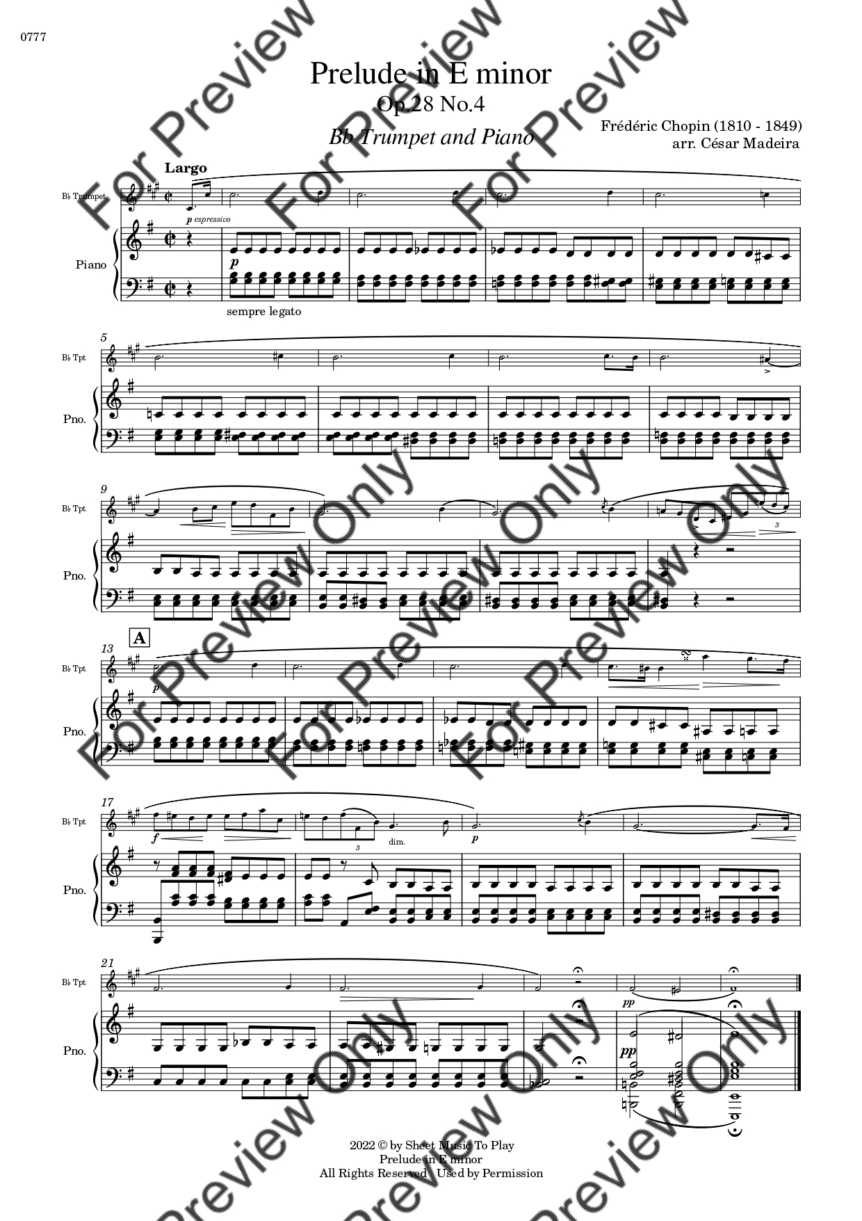 Prelude in E Minor, Op.28 No.4 by Frederic Chopin. Arrangement for Bb Trumpet and Piano. With Full Score and Individual Parts. Have fun!