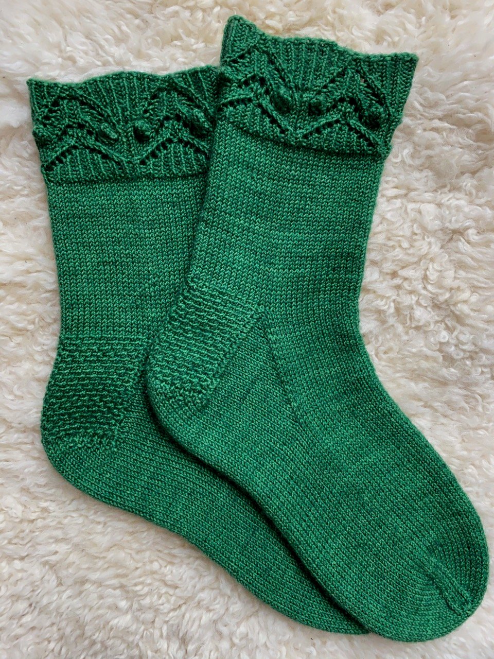 Noella is a pair of socks with a bit of lace and some bobbles for a very feminine look.