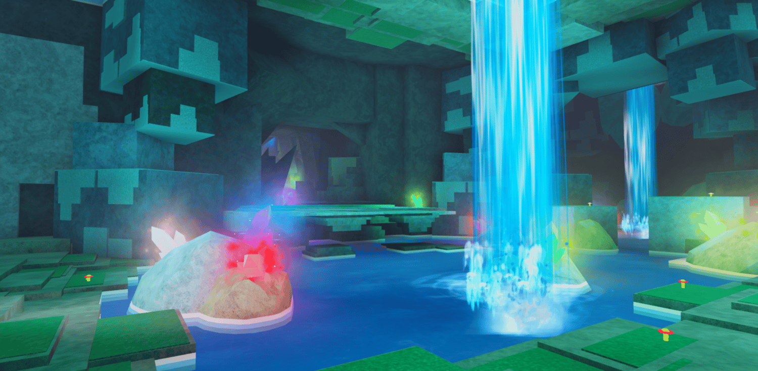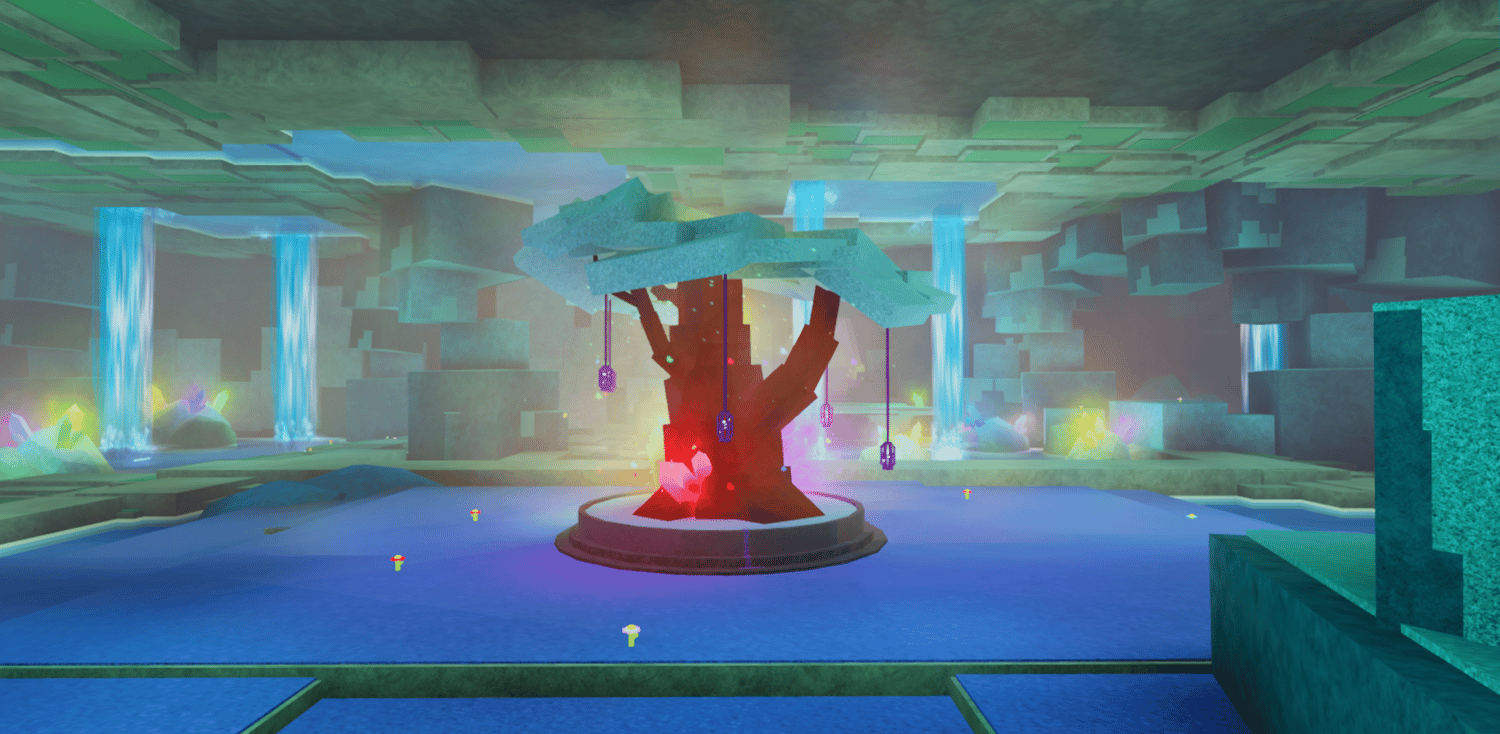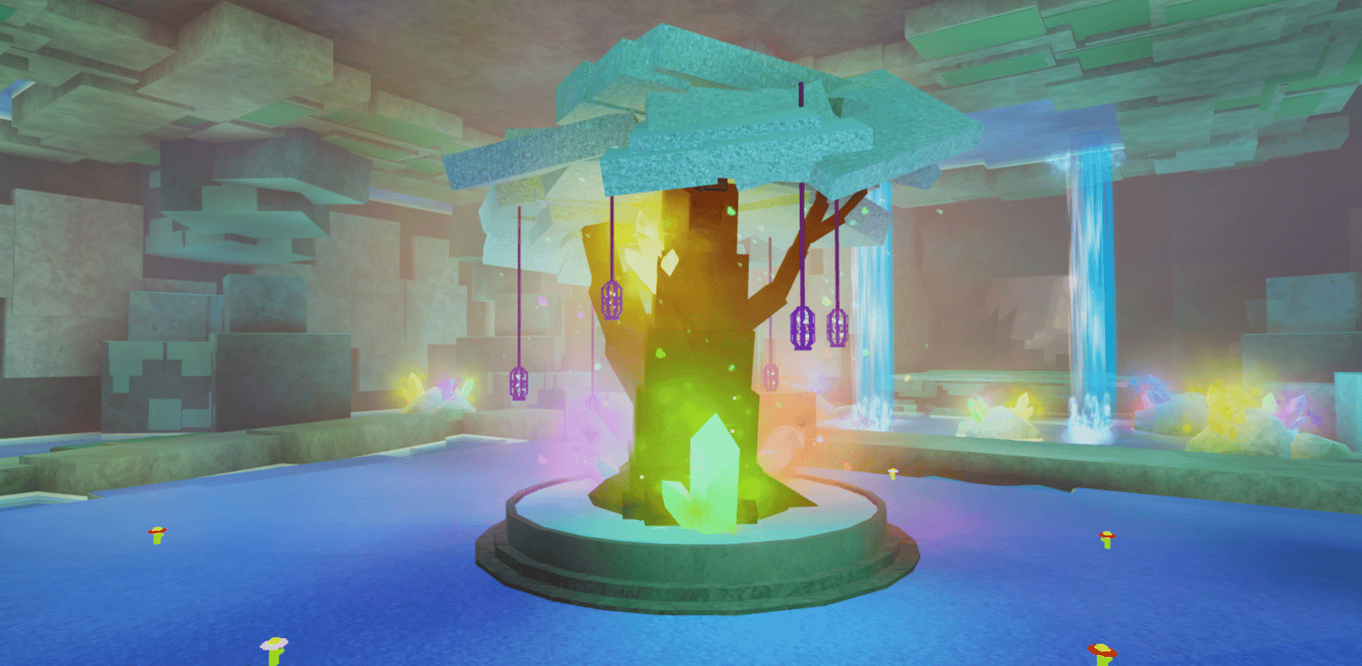 A magical low poly crystal cavern featuring cascading waterfalls, glowing multicolored crystals, and a mystical tree centerpiece with hanging lanterns surrounded by shimmering pools. Blocky stylized terrain creates layered platforms of moss-covered stone while vibrant crystals in pink, blue, yellow, green, and purple illuminate the underground depths. Dark tunnel passages lead to expansive chambers filled with rainbow-colored formations and scattered mushrooms. Soft atmospheric lighting and flowing water create a serene yet enchanting underground world. The layout supports exploration across multiple connected chambers and vertical layers. Perfect for fantasy RPGs, adventure games, mining experiences, pet simulators, or cinematic showcases.