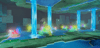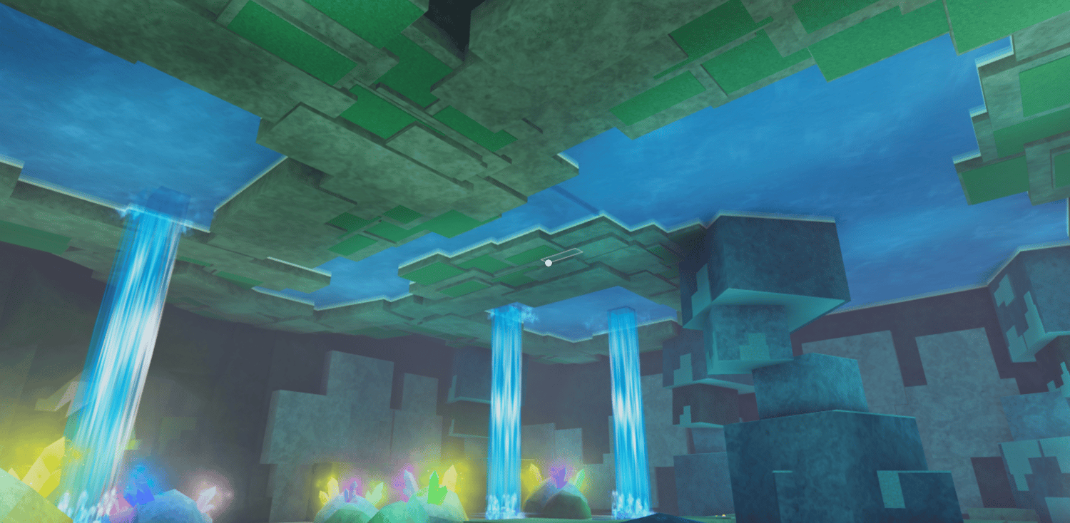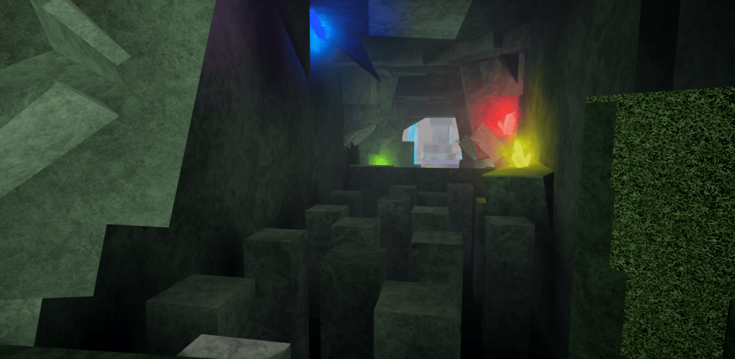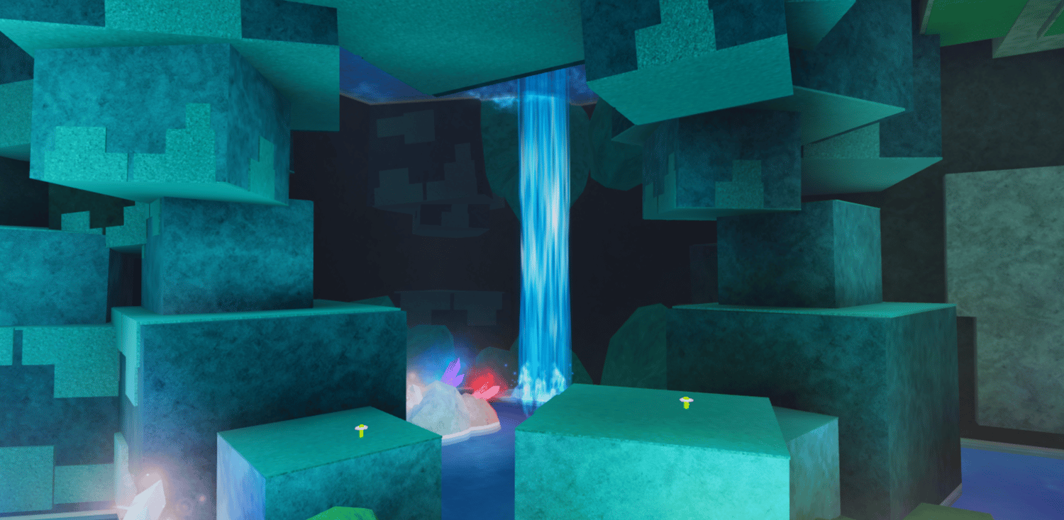 A magical low poly crystal cavern featuring cascading waterfalls, glowing multicolored crystals, and a mystical tree centerpiece with hanging lanterns surrounded by shimmering pools. Blocky stylized terrain creates layered platforms of moss-covered stone while vibrant crystals in pink, blue, yellow, green, and purple illuminate the underground depths. Dark tunnel passages lead to expansive chambers filled with rainbow-colored formations and scattered mushrooms. Soft atmospheric lighting and flowing water create a serene yet enchanting underground world. The layout supports exploration across multiple connected chambers and vertical layers. Perfect for fantasy RPGs, adventure games, mining experiences, pet simulators, or cinematic showcases.