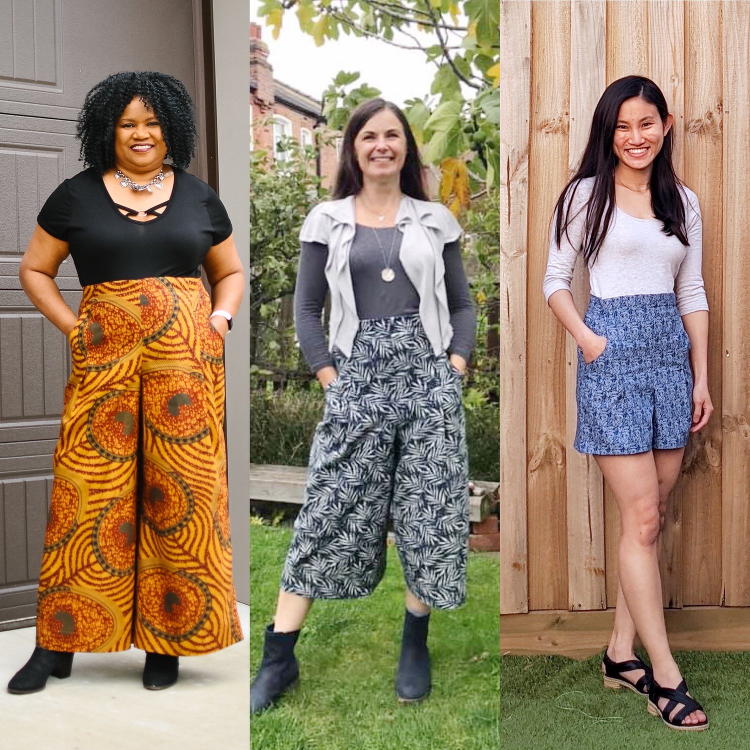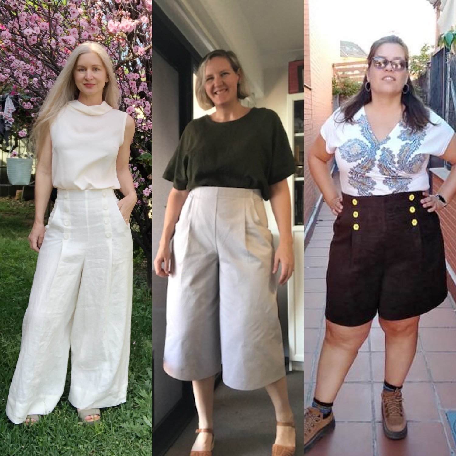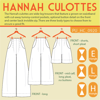 The Hannah Culottes are wide-leg trousers that feature a self-faced high waist with an optional button detail on the front pleat, and a center back zip. The cut-away pockets cleverly flatten the belly for a flattering finish. Style options include midi and shorts length.