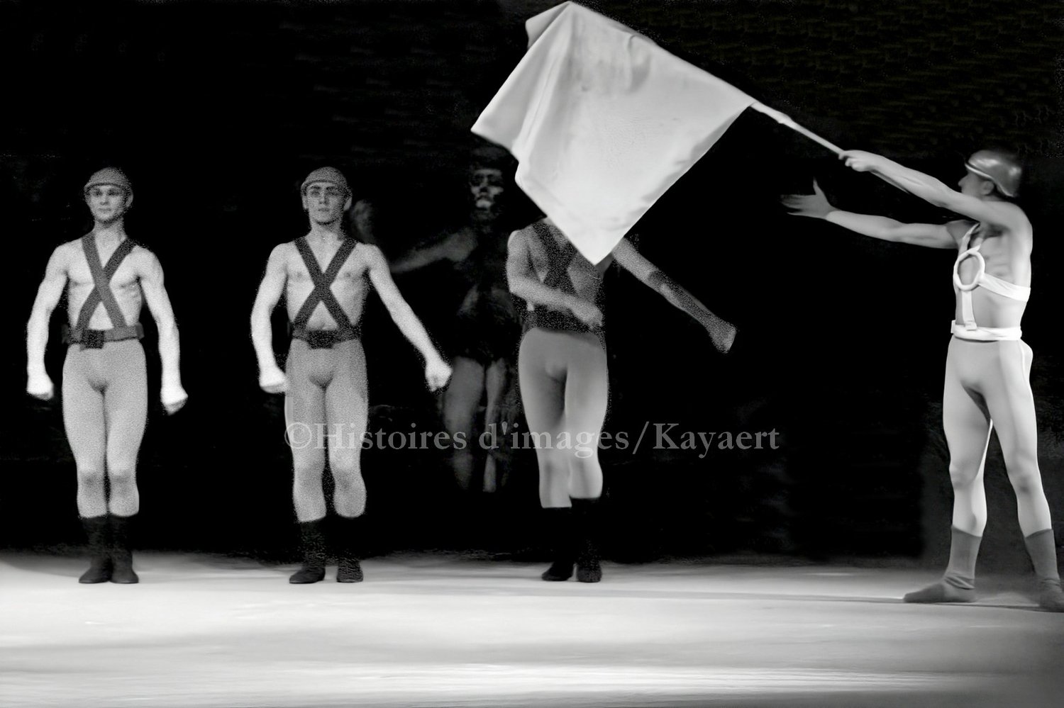 A powerful black-and-white photograph by Belgian photographer Robert Kayaert, capturing a moment from La Table Verte – the famous anti-war ballet choreographed by Kurt Jooss. This haunting and historically significant performance, first created in 1932, is known for its strong expressionist style and political message. Kayaert’s photo highlights the stark contrasts and intense atmosphere of the stage.