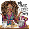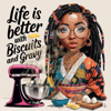 Serve up soulful flavor and fierce style with this Biscuits & Blessings PNG Collection! This vibrant set features four stunning Afrocentric caricatures of confident Black women chefs dressed in bold Ankara-patterned kimonos, rocking natural hairstyles, chunky jewelry, and joyful kitchen vibes. Surrounded by baking essentials like flour, eggs, butter, and customized mixers, each queen is framed with the playful and inspiring phrase: “Life is Better with Biscuits and Gravy.”