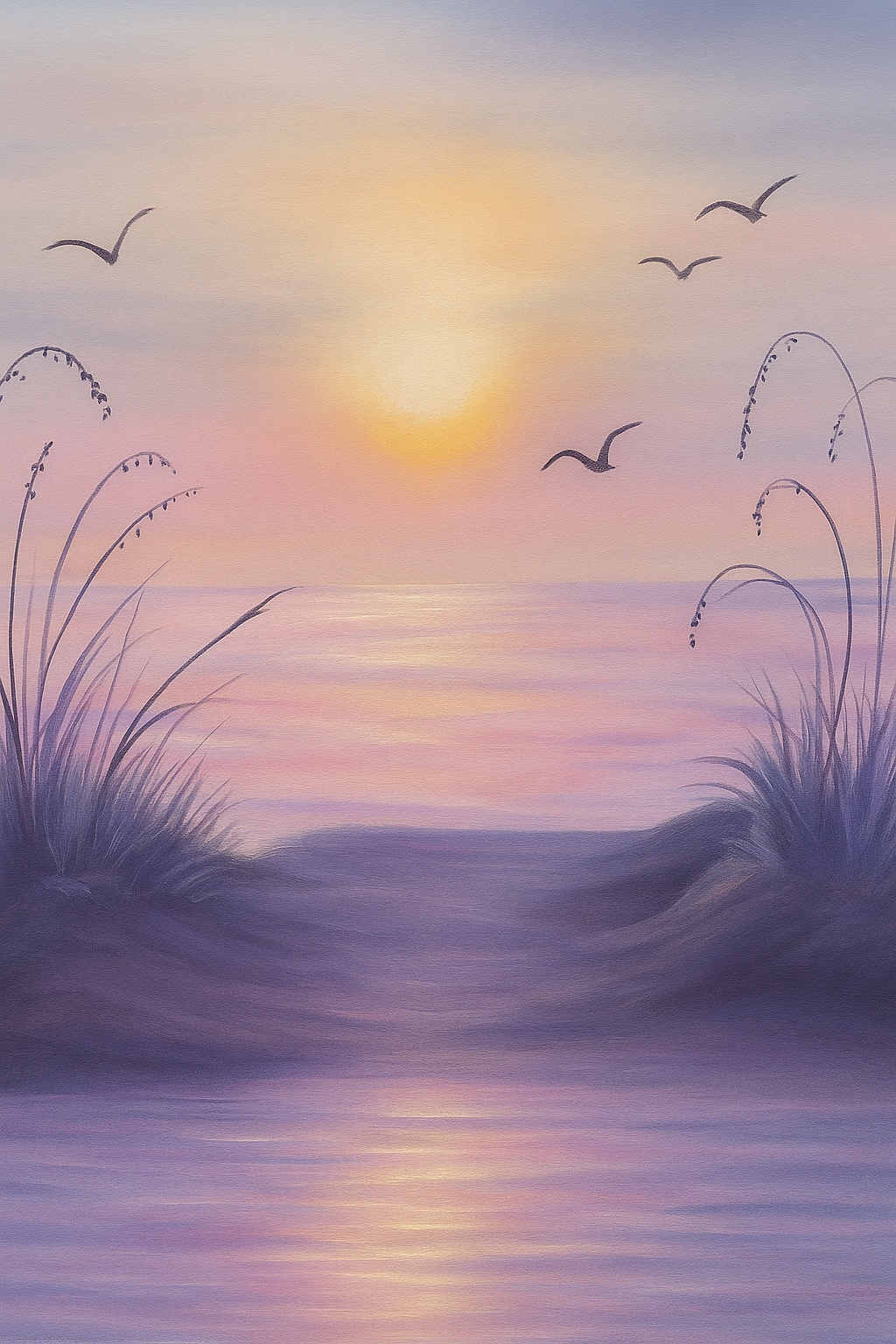 Painted in soft pastels with birds in flight and warm coastal light, this artwork invites you to come back to yourself β calmly, fully, and unhurried.