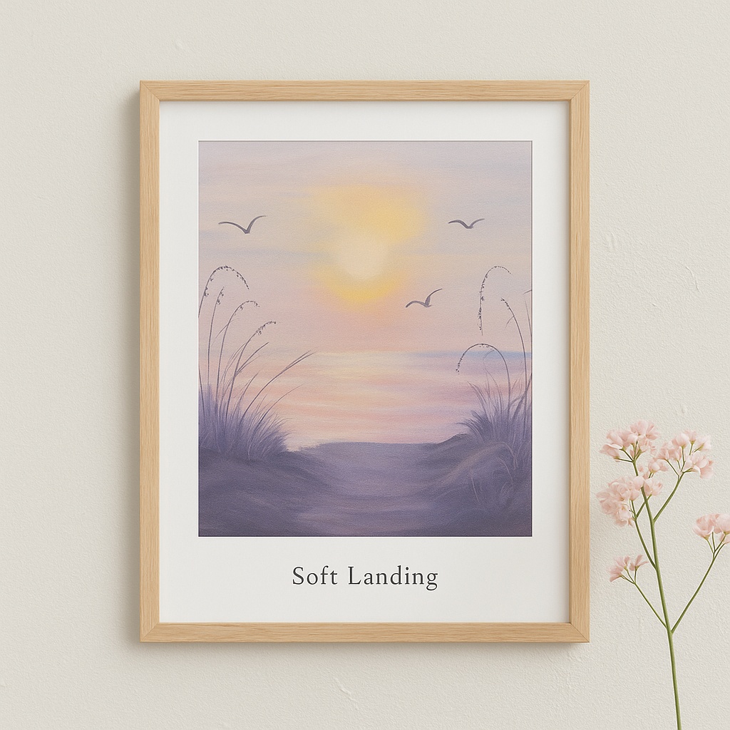 Soft Landing is a gentle sunrise seascape meant to hold you during transitions β the quiet mornings, the deep exhales, the sacred pauses between grief and growth.