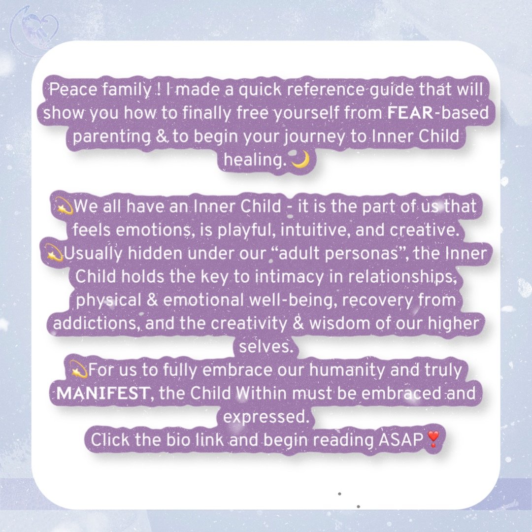 Peace family ! I made a quick reference guide that will show you how to finally free yourself from 𝗙𝗘𝗔𝗥-based parenting & to begin your journey to Inner Child healing. Check out my social media (@celestialparenting) for more FREEtips. 🌙