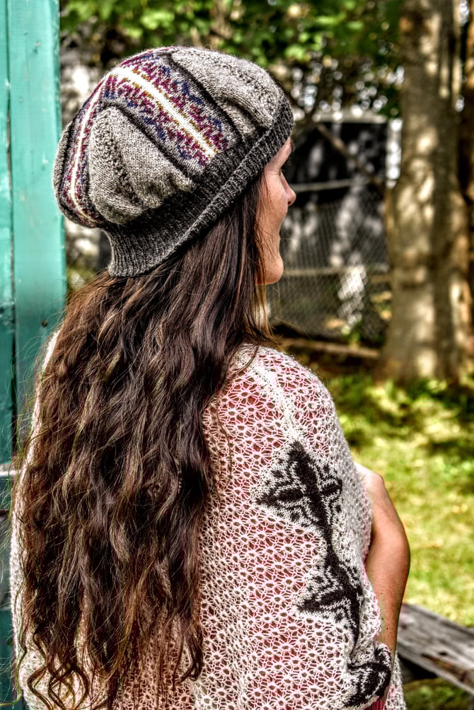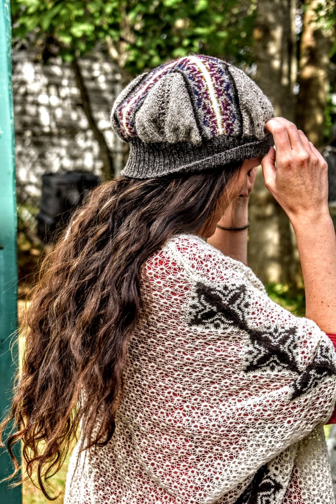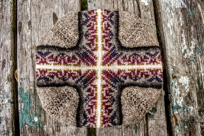 The first of five of the Noggin Cove Islands Collection, Noggin Island is a modular tam featuring mitered bands of striking Fair Isle and four little panels of a traditional Shetland lace motif, Da Flee. One set of Fair Isle is worked first and then stitches are picked up to work the second set. Stockinette/lace corners are then filled in and the hat is finished with ribbing to desired brim length. The pattern is written with a steeked option (Fair Isle in the round) and a non-steeked option (Fair Isle flat).