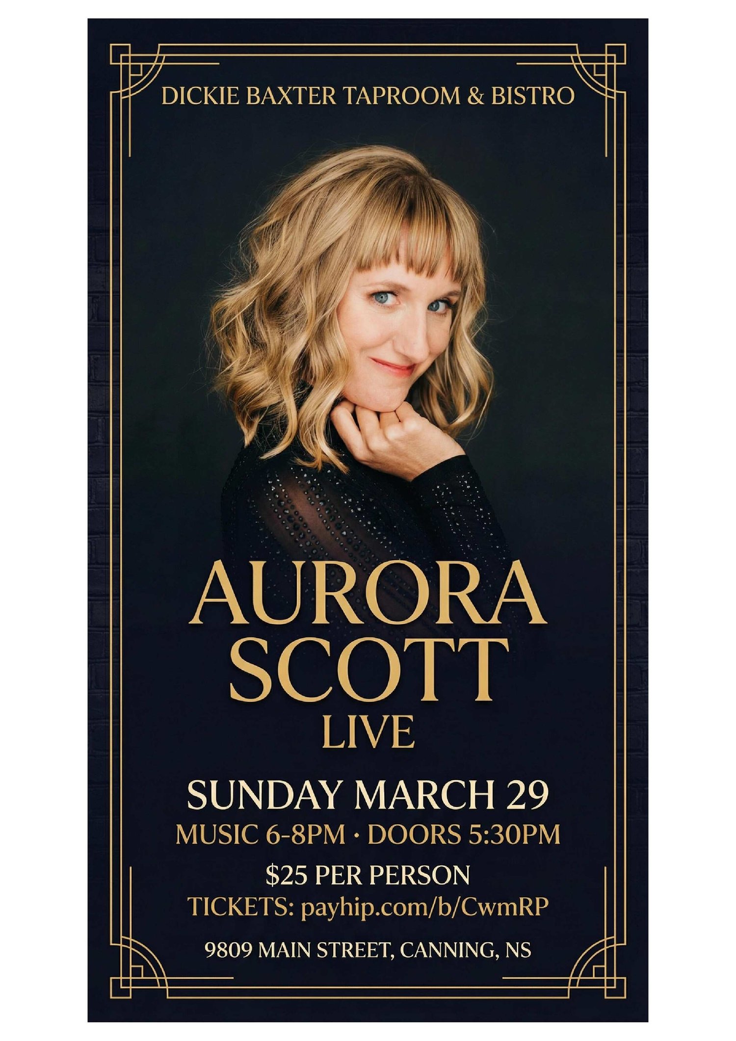 We're thrilled to welcome Nova Scotia's Aurora Scott to our intimate bistro for a special evening of live music. Known for her sultry vocals, natural elegance, and captivating stage presence, Aurora has been earning praise across the Maritimes for performances that feel personal, powerful, and utterly unforgettable.