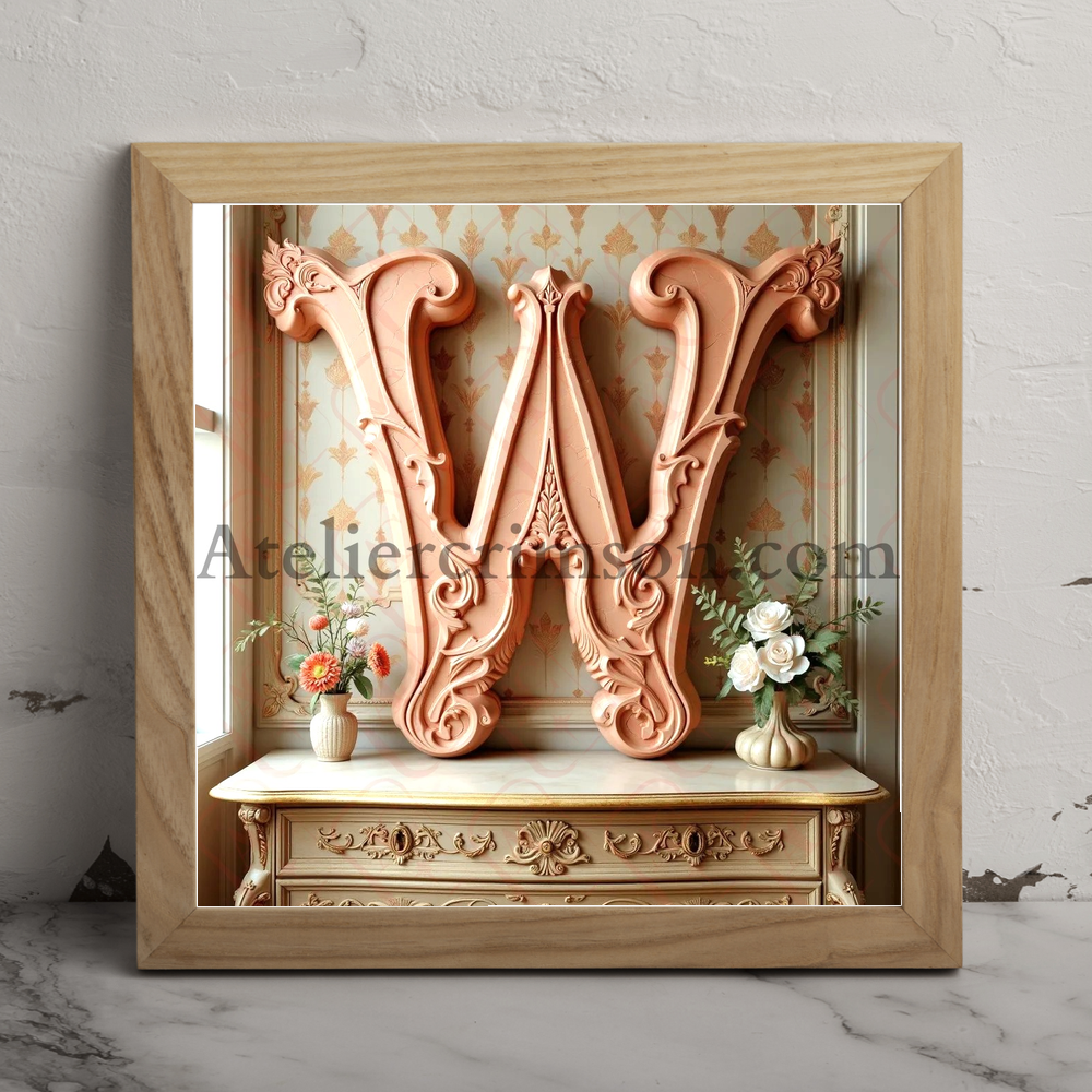 The letter W terracotta Art Nouveau typeface inspired by Alphonse Mucha's with flowing lines and floral motifs, set against a soft, muted background with a gilded wooden dresser and subtle lighting effects.