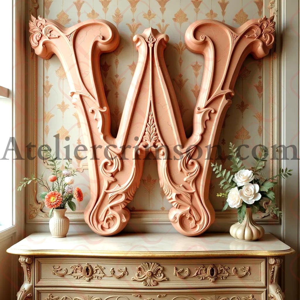 The letter W terracotta Art Nouveau typeface inspired by Alphonse Mucha's