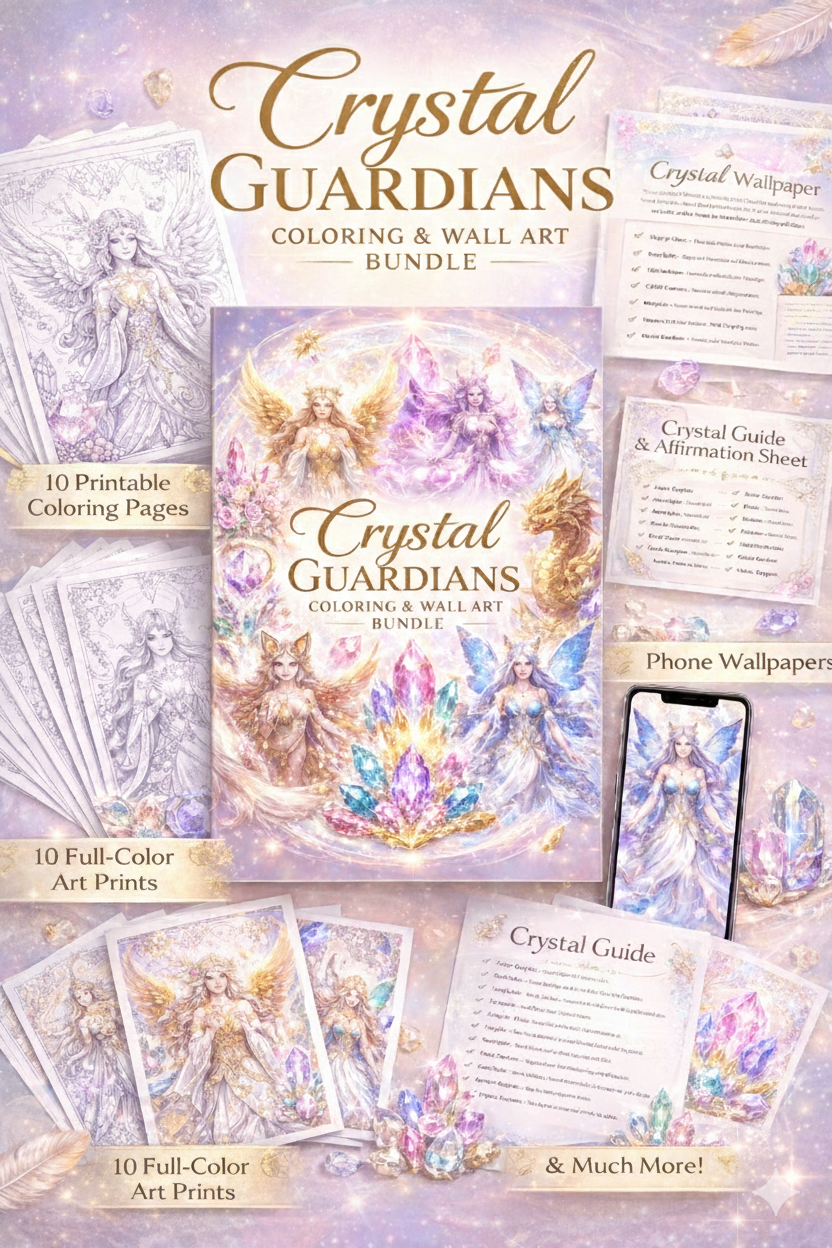 This full Crystal Guardians bundle combines vibrant color artwork, printable coloring pages, and meaningful bonuses designed to support creativity, calm, and spiritual intention.