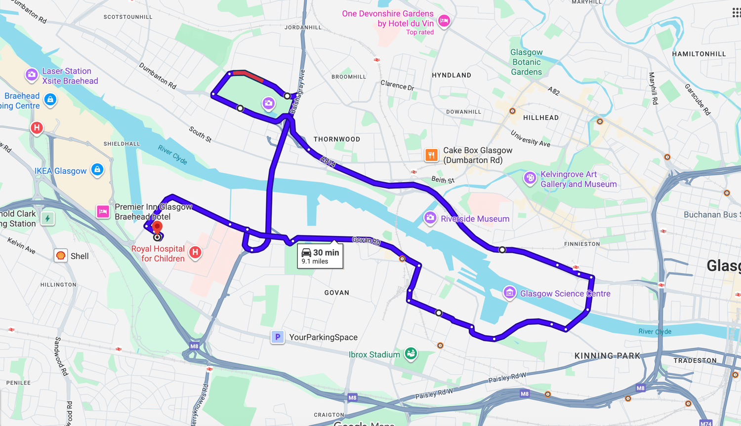 Practise real driving test routes in Glasgow (Shieldhall) before your exam – open directly in Google Maps
