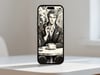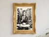 This artwork portrays a stylish and cinematic atmosphere set in a European café. The monochromatic palette, combined with refined linework and shading, enhances the sense of depth and sophistication.