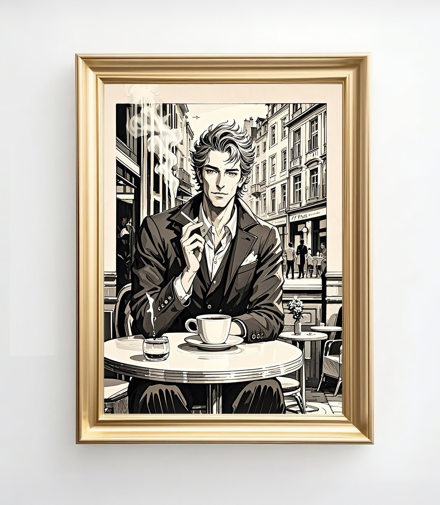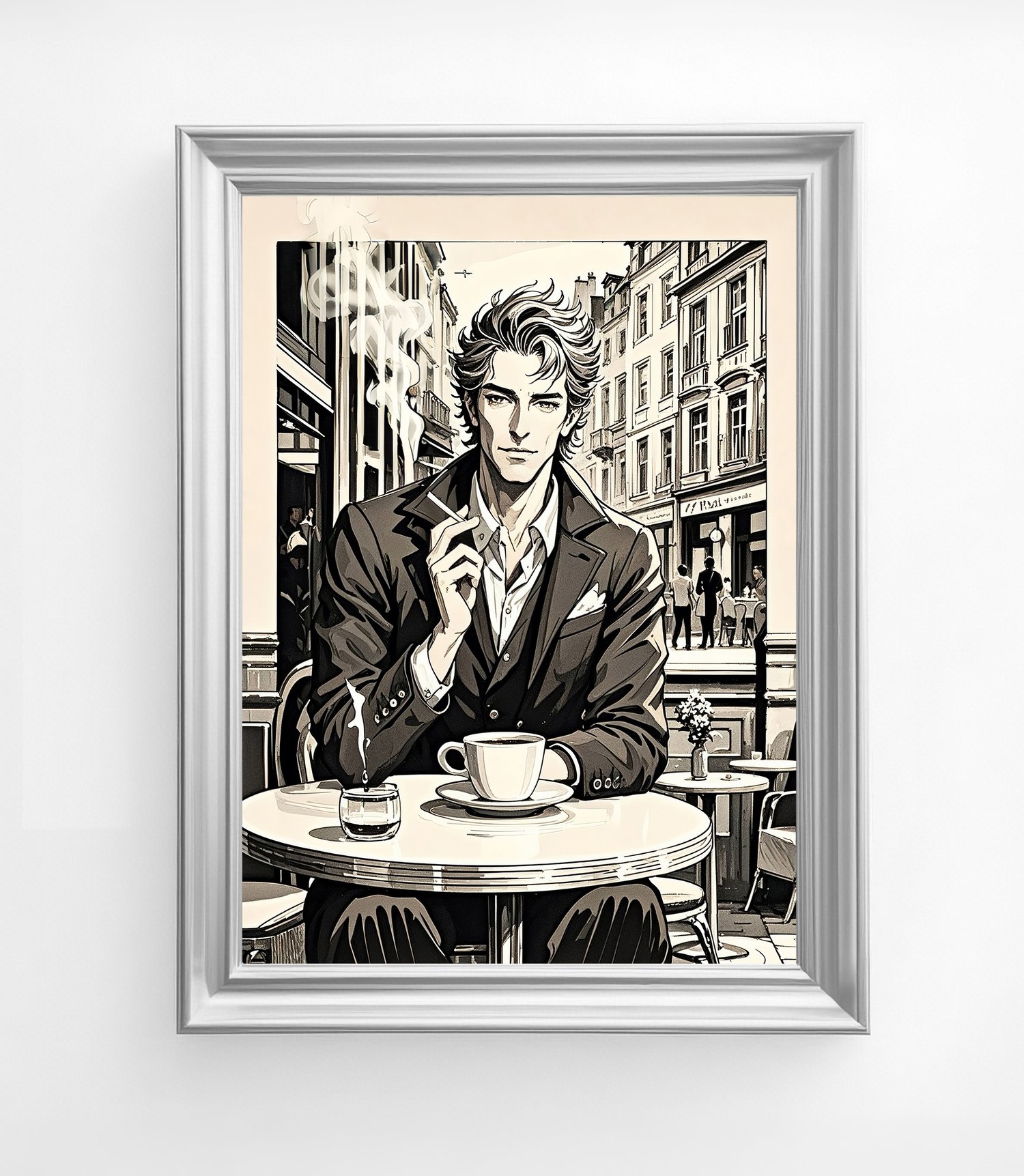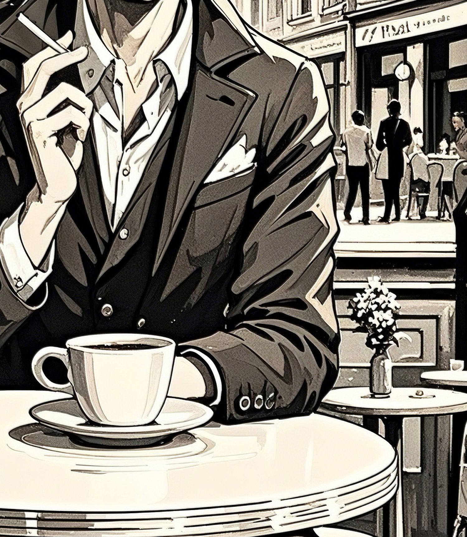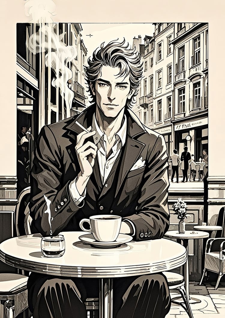 The central figure is striking—his composed demeanor, sharp gaze, and tailored suit radiate elegance. The details of the coffee cup, cigarette, and smoke contribute to a literary, almost noir-inspired mood. The carefully rendered background of buildings and café tables further anchors the scene, making it feel like a still frame from a film or the cover of a graphic novel.
