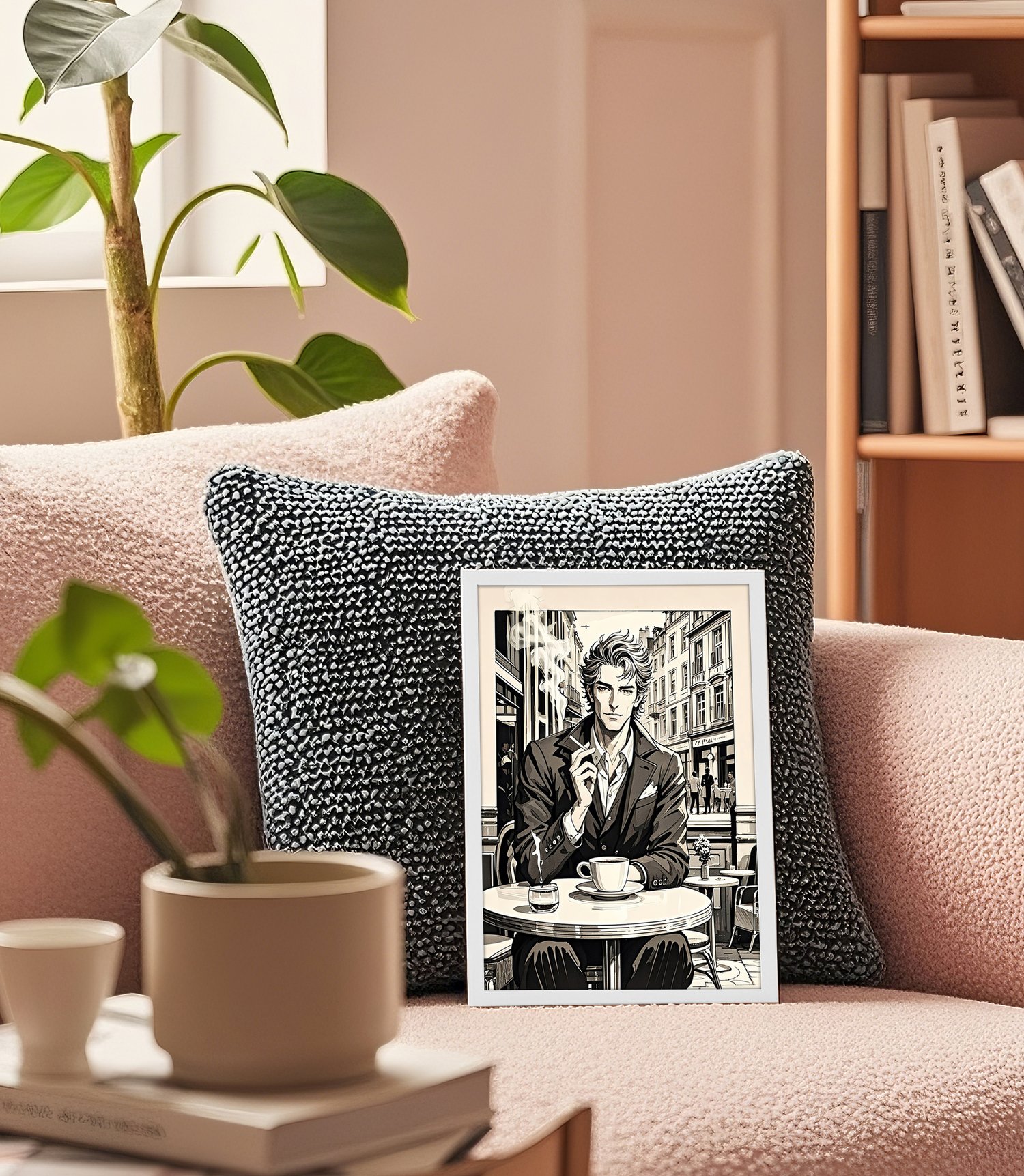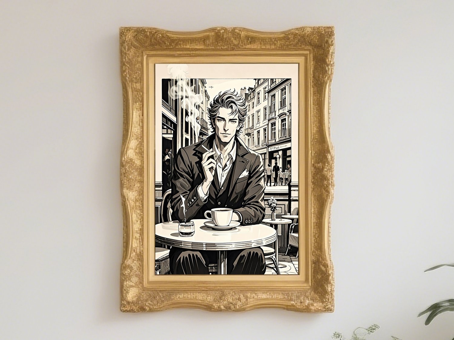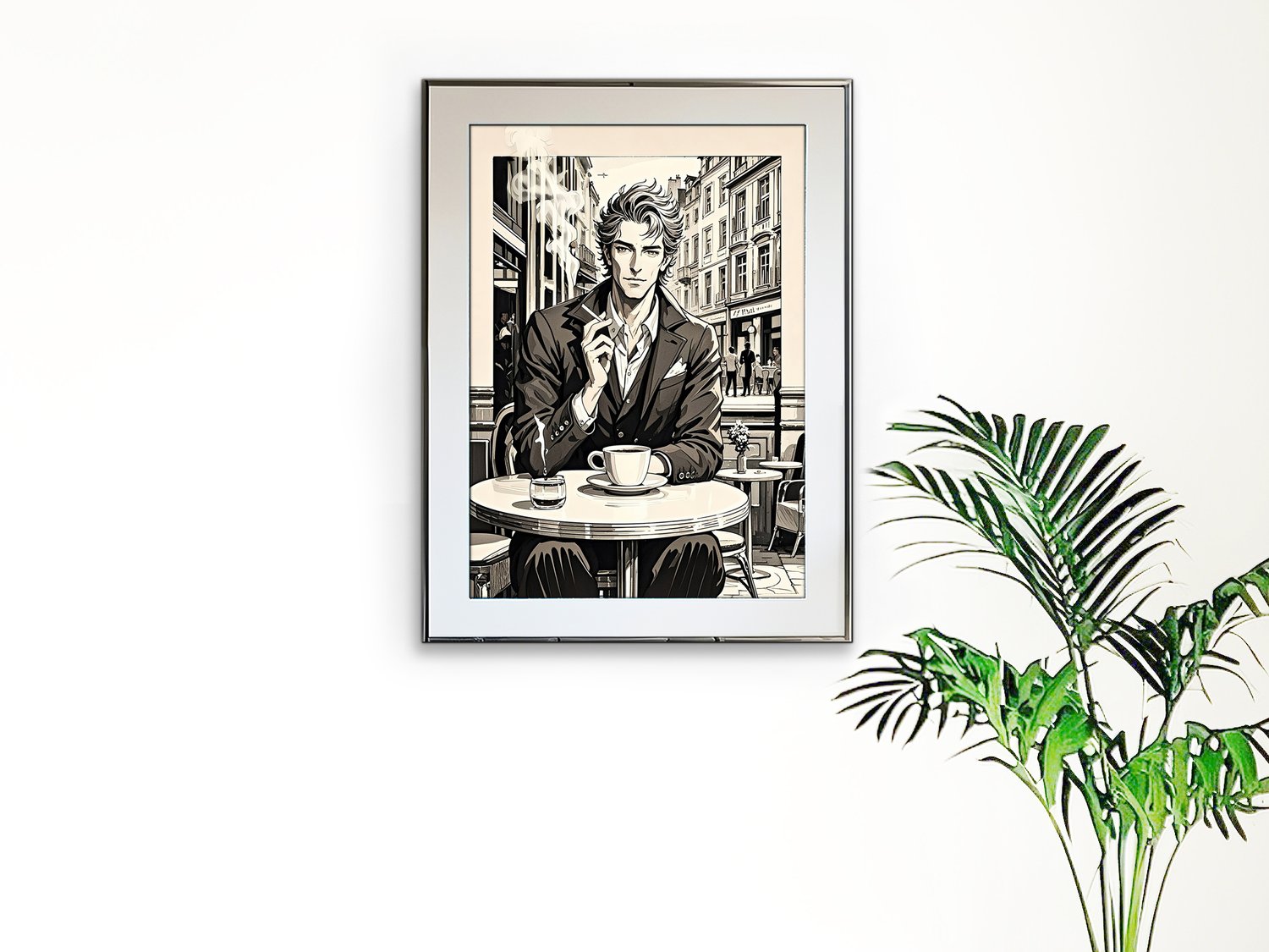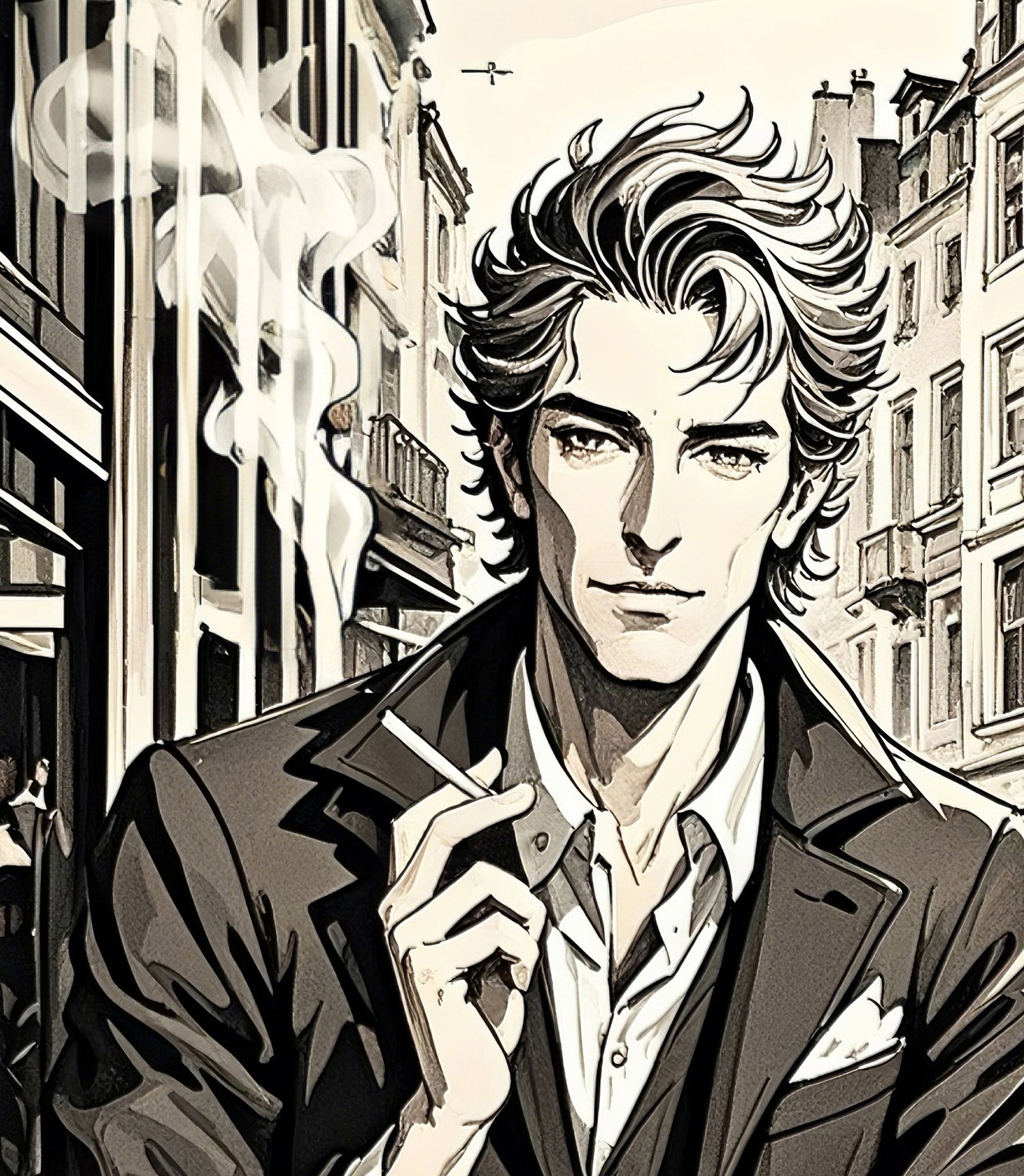 The central figure is striking—his composed demeanor, sharp gaze, and tailored suit radiate elegance. The details of the coffee cup, cigarette, and smoke contribute to a literary, almost noir-inspired mood. The carefully rendered background of buildings and café tables further anchors the scene, making it feel like a still frame from a film or the cover of a graphic novel.