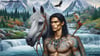 An Indian walks through rapids with his horse. Patterned style sketch.