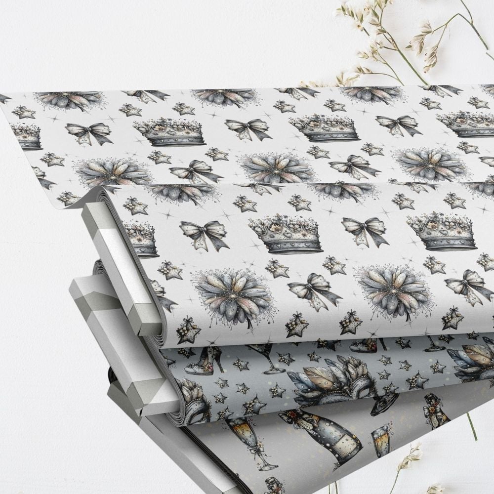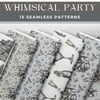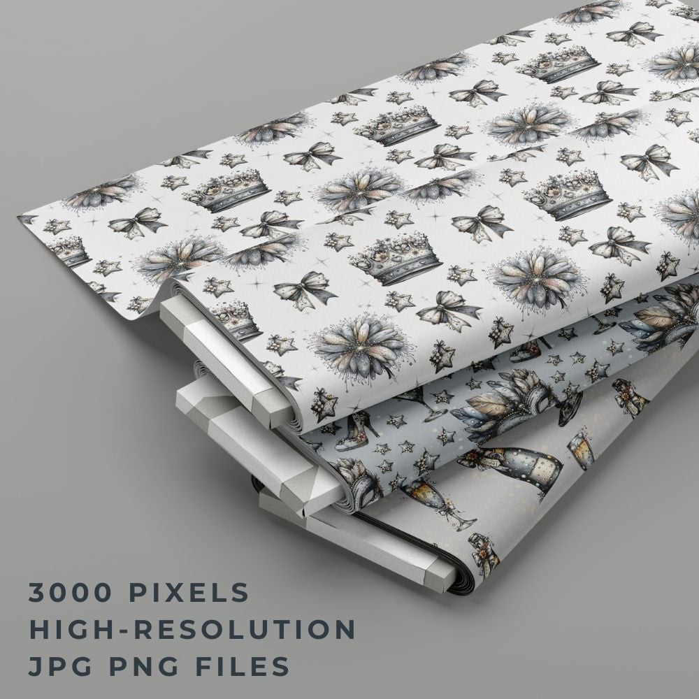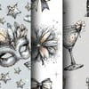 Each seamless pattern is carefully illustrated and tile-ready, making it ideal for both digital and printed projects. The muted silver, champagne, and soft gray palette gives the set a luxurious, whimsical, and modern holiday vibe.