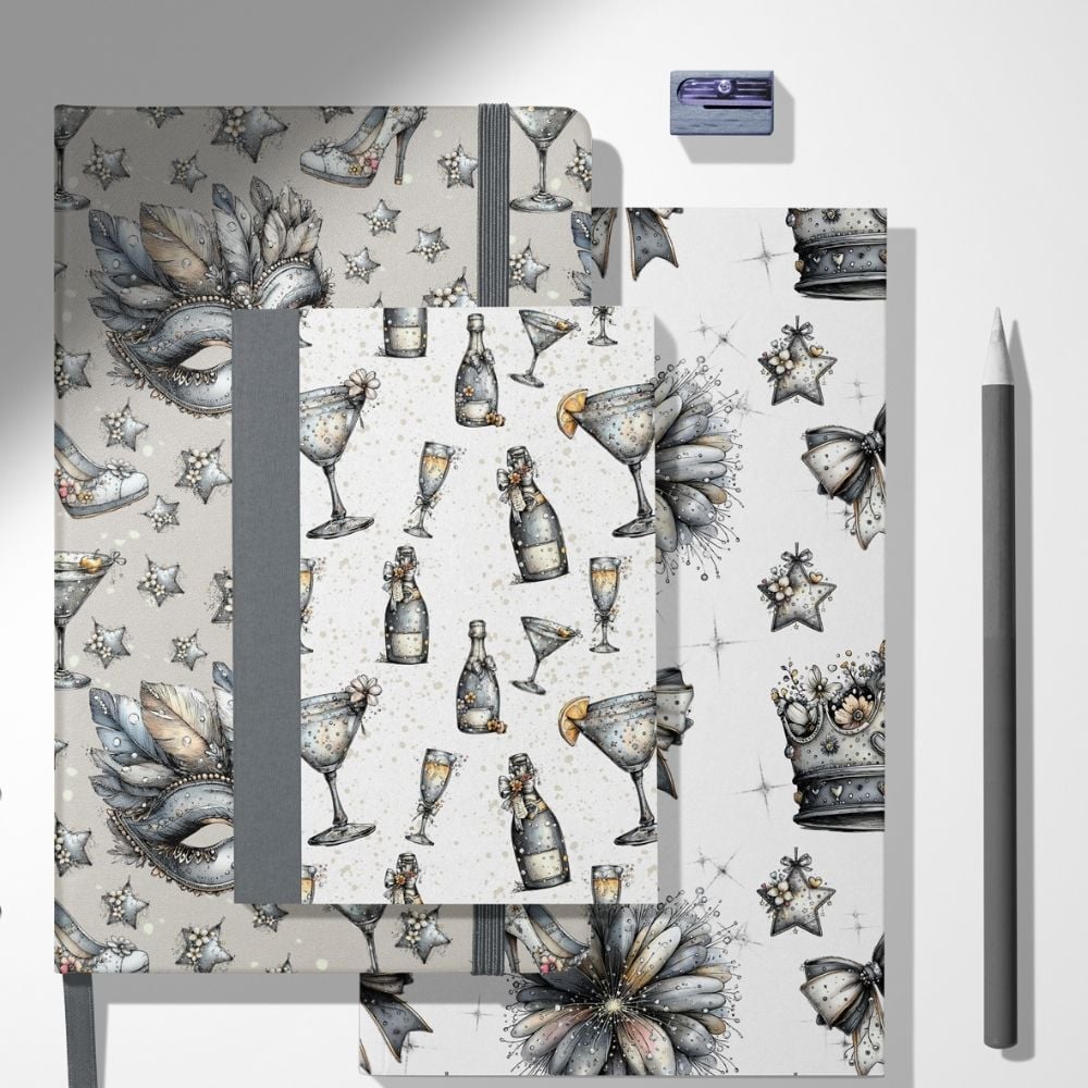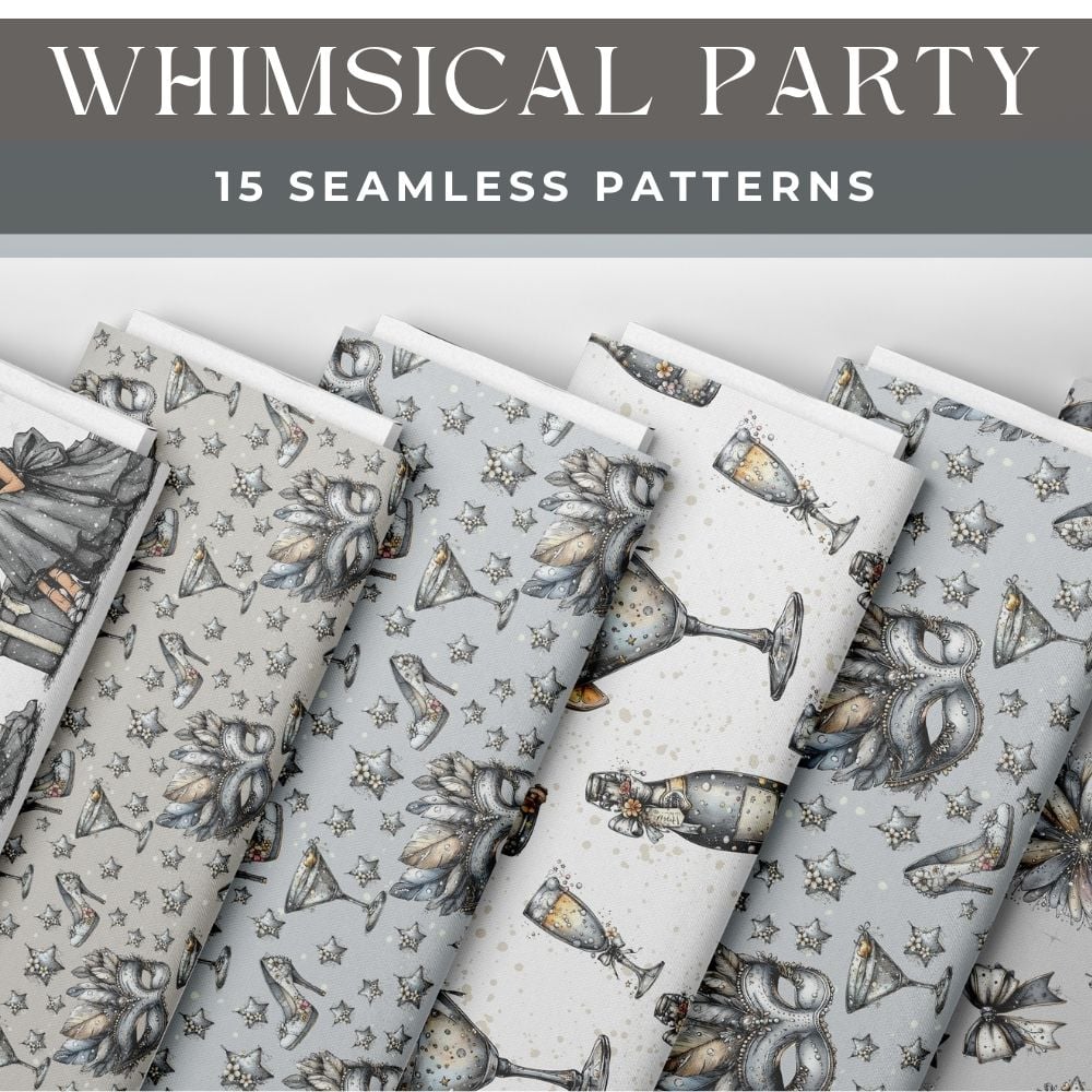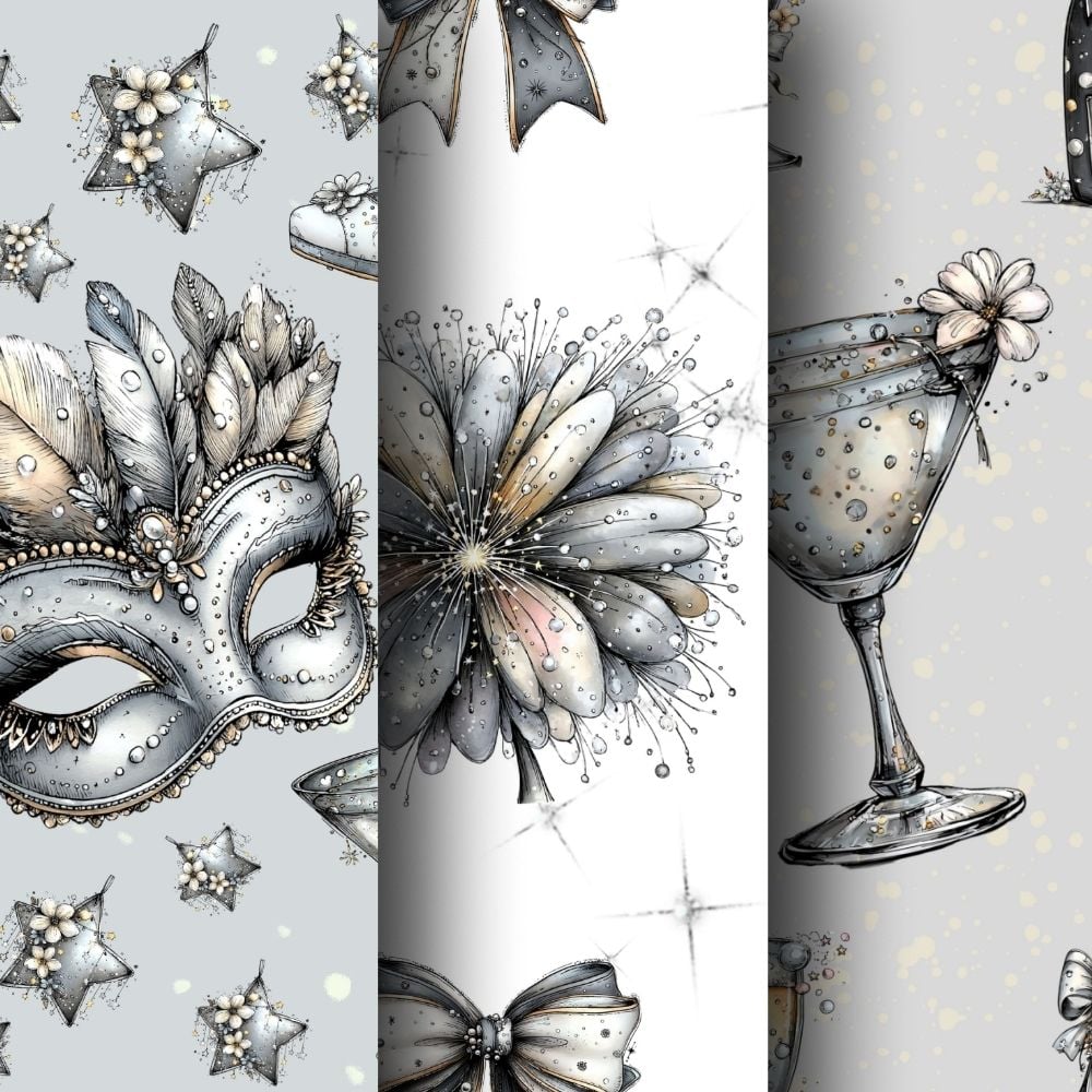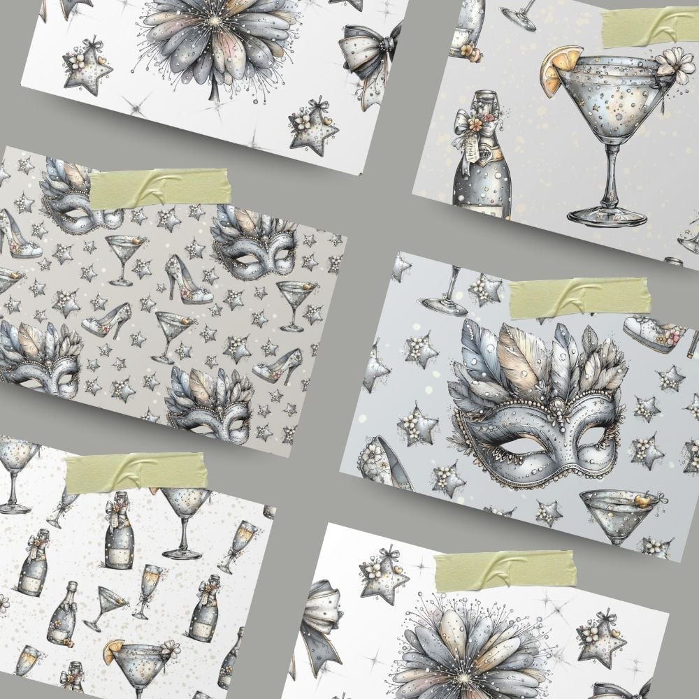 Celebrate the new year in style with this enchanting collection of 15 Whimsical New Year’s Party Seamless Patterns. Filled with hand-drawn champagne glasses, sparkling stars, masquerade masks, elegant party outfits, confetti, and festive decorations—this set brings a magical and sophisticated touch to your celebration-themed designs.