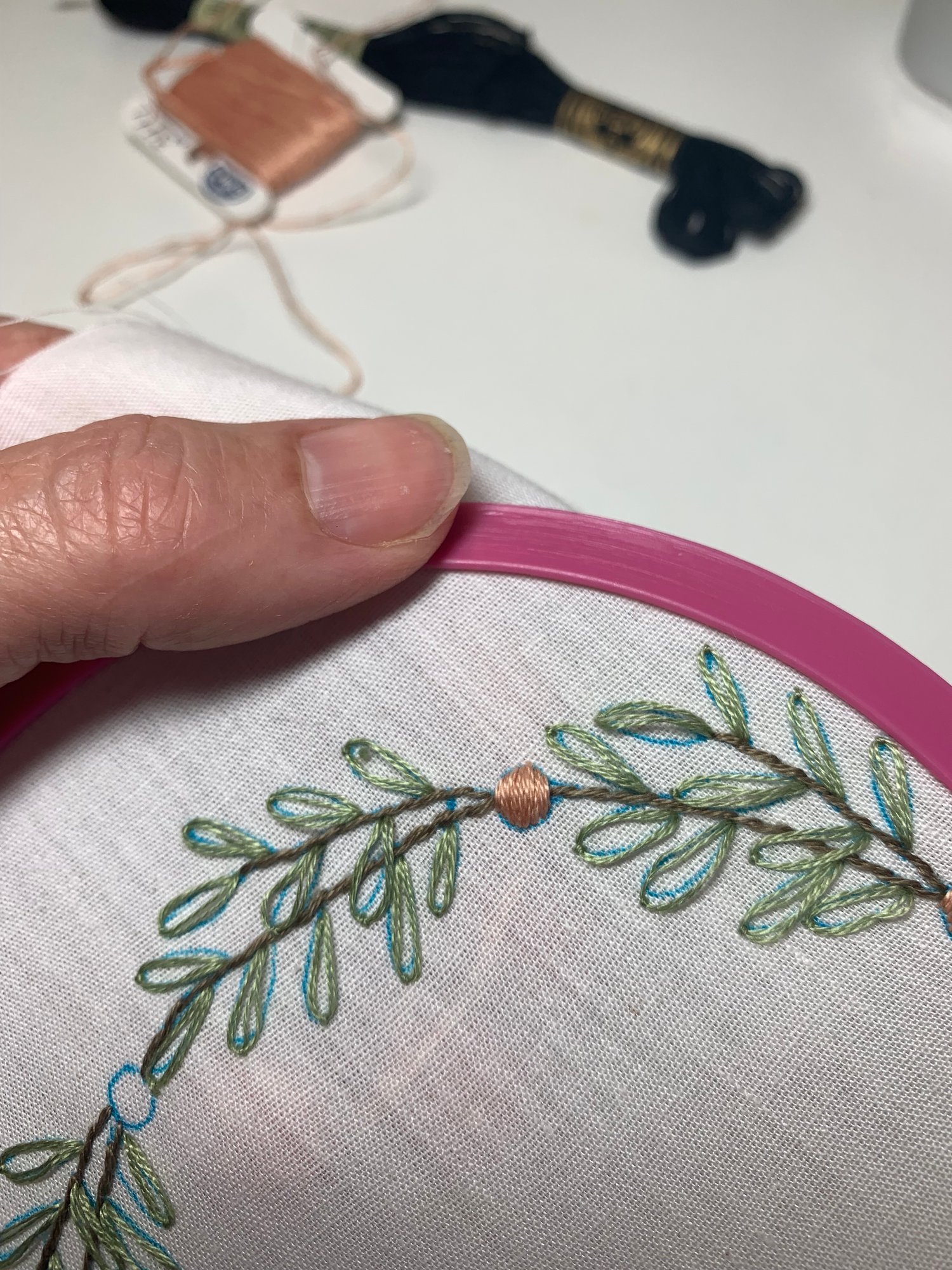 Instructions for stitches like stem stitch, satin stitch, and lazy daisy stitch.