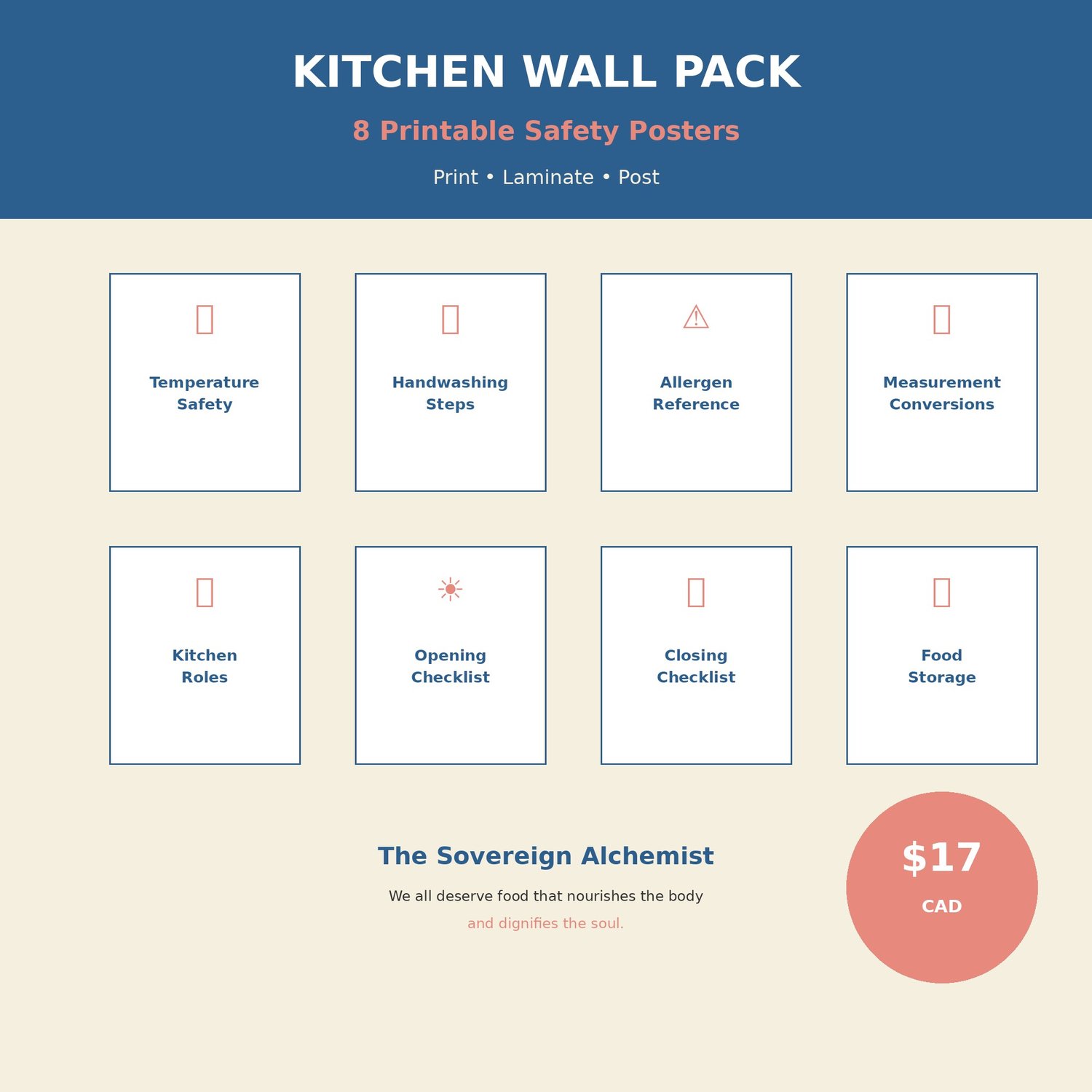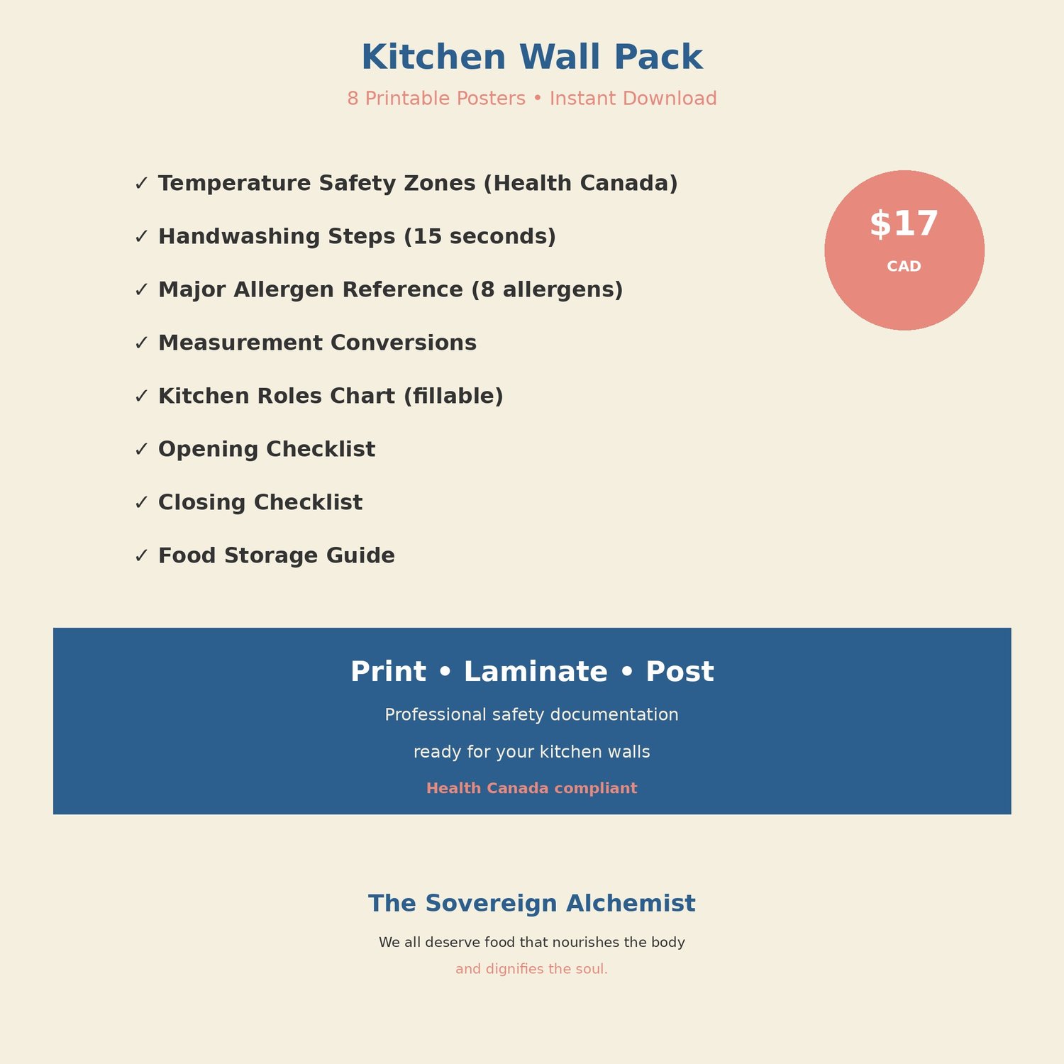 These aren't generic posters from the internet. They're designed for community kitchens โ clear, practical, and Health Canada compliant.