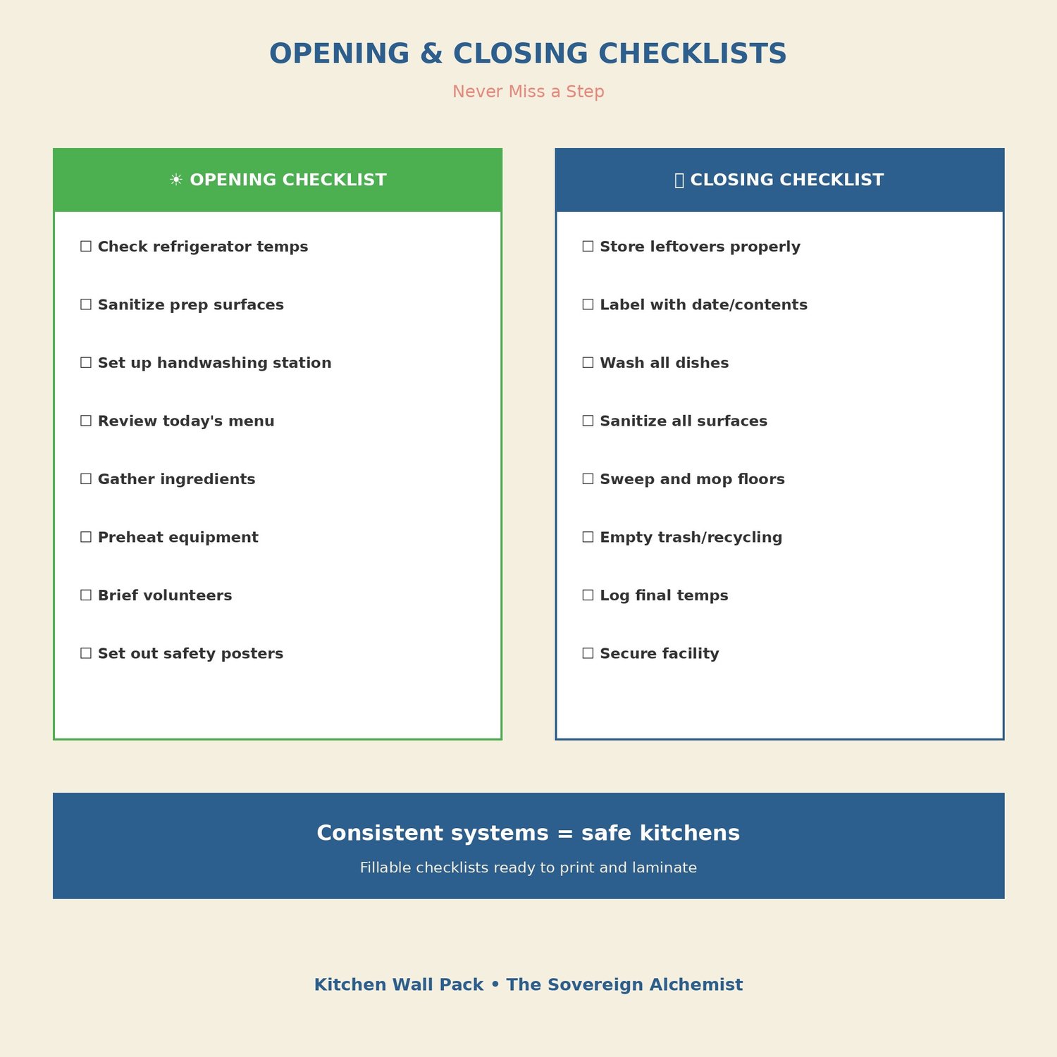 โ๏ธ Opening Checklist Everything to do before service: check temps, sanitize surfaces, set up stations, brief volunteers. Check the box, move on.