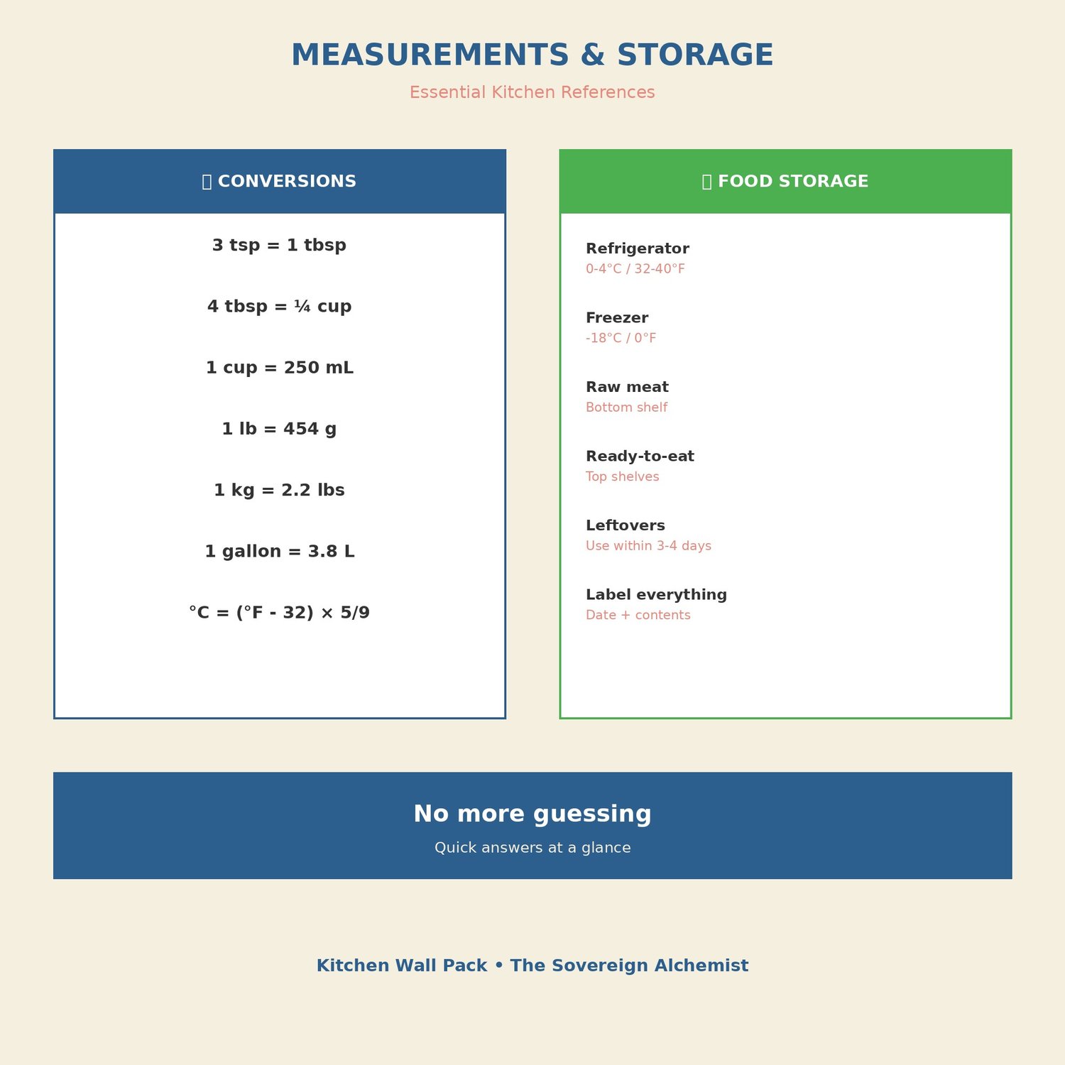 ๐ Measurement Conversions Teaspoons to tablespoons, cups to millilitres, pounds to kilograms, temperature conversions. No more math in the middle of service.
