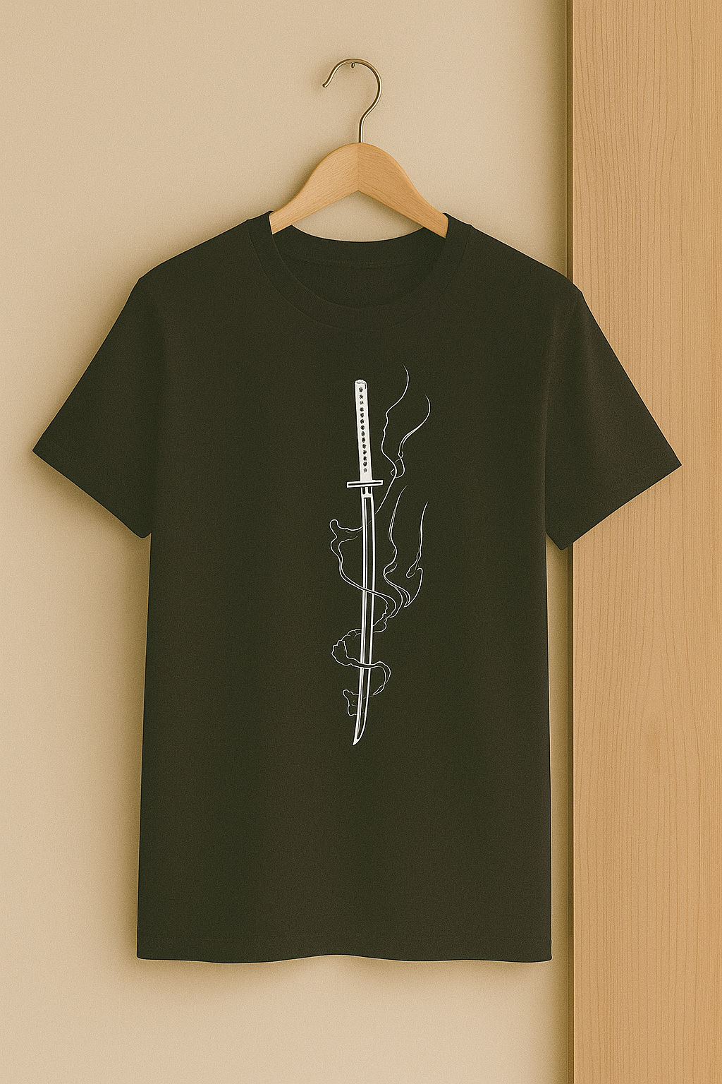 Unique black T-shirt with an aesthetic katana sword design ⚔️🔥 Perfect for anime fans, Japanese streetwear lovers and minimal fashion style. Available in multiple sizes, soft cotton comfort. Wear your vibe with this bold design!"