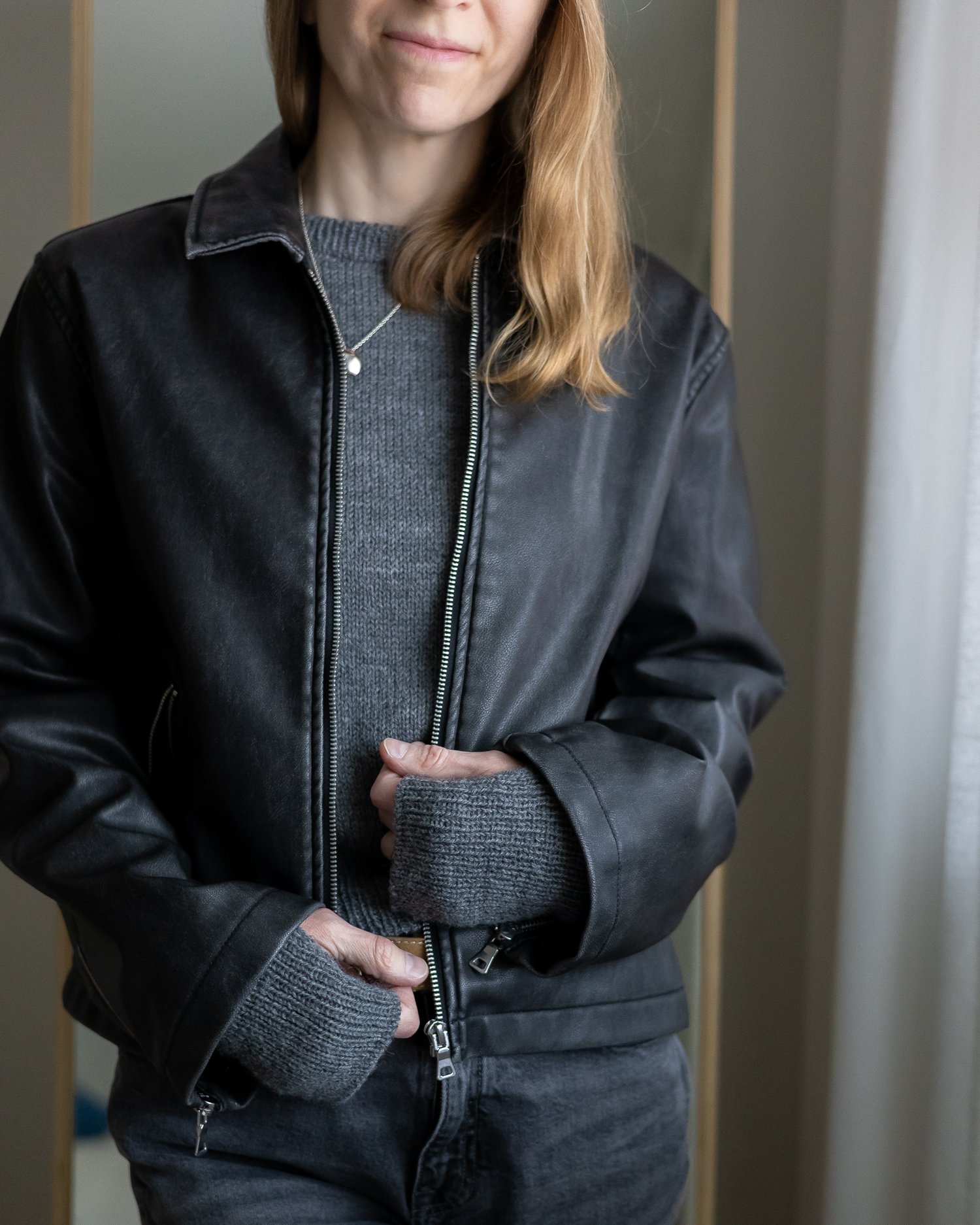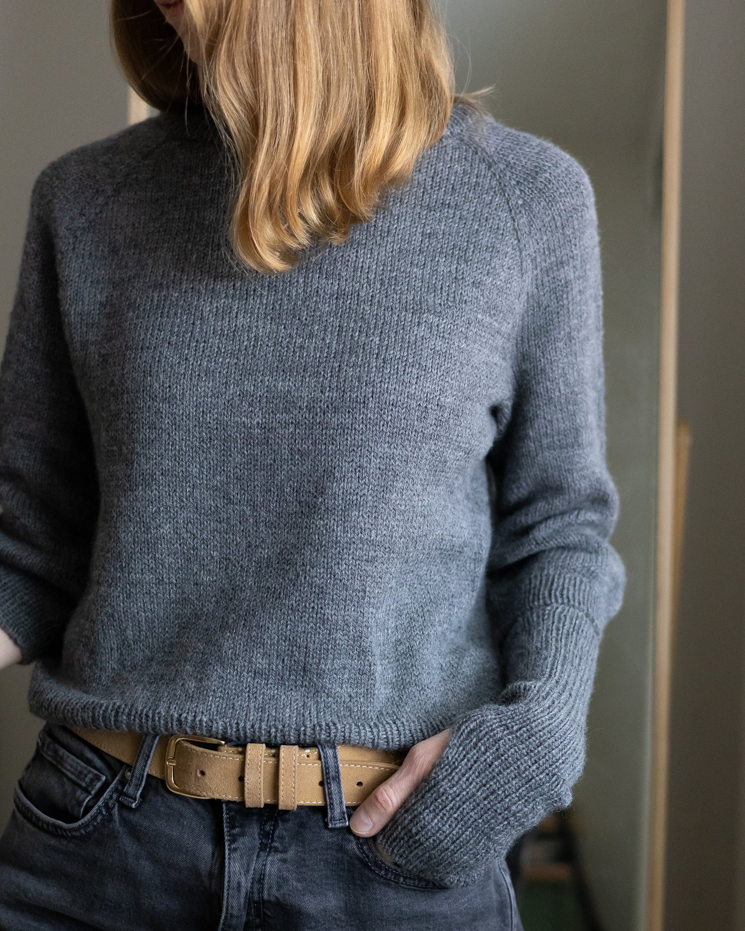 Simple sweater with elbow length raglan sleeves and a pair of fingerless mittens. The sweater is worked from top down, starting with the folded neck ribbing. The work continues with the short row shaping on neckline and raglan increases. When the yoke is completed, sleeve stitches are placed on hold. The body is then worked in the round towards the hem. Sleeve stitches are then placed back on the needles and the sleeves are worked in the round towards the cuffs.