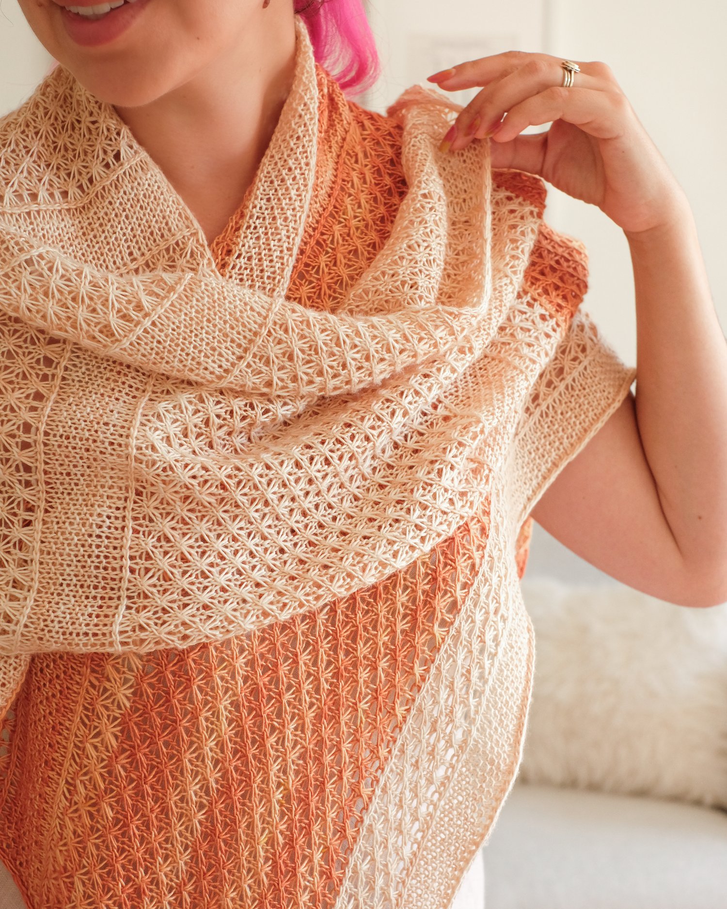 This shawl is a tribute to the warmth, vibrancy, and fleeting beauty of a Californian summer. It was designed as a two-skein project to showcase magical Summer Solstice colorways by A Verb For Keeping Warm inspired by Monarch butterflies and California poppies. And so the piece captures the delicate balance of movement and stillness — of flutter and bloom.