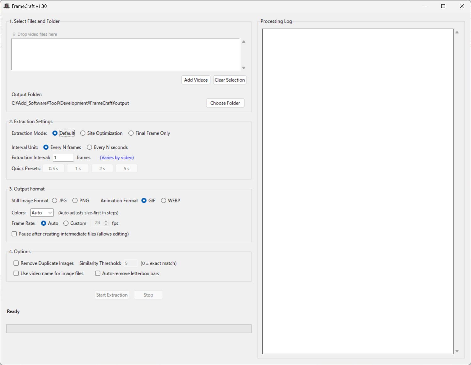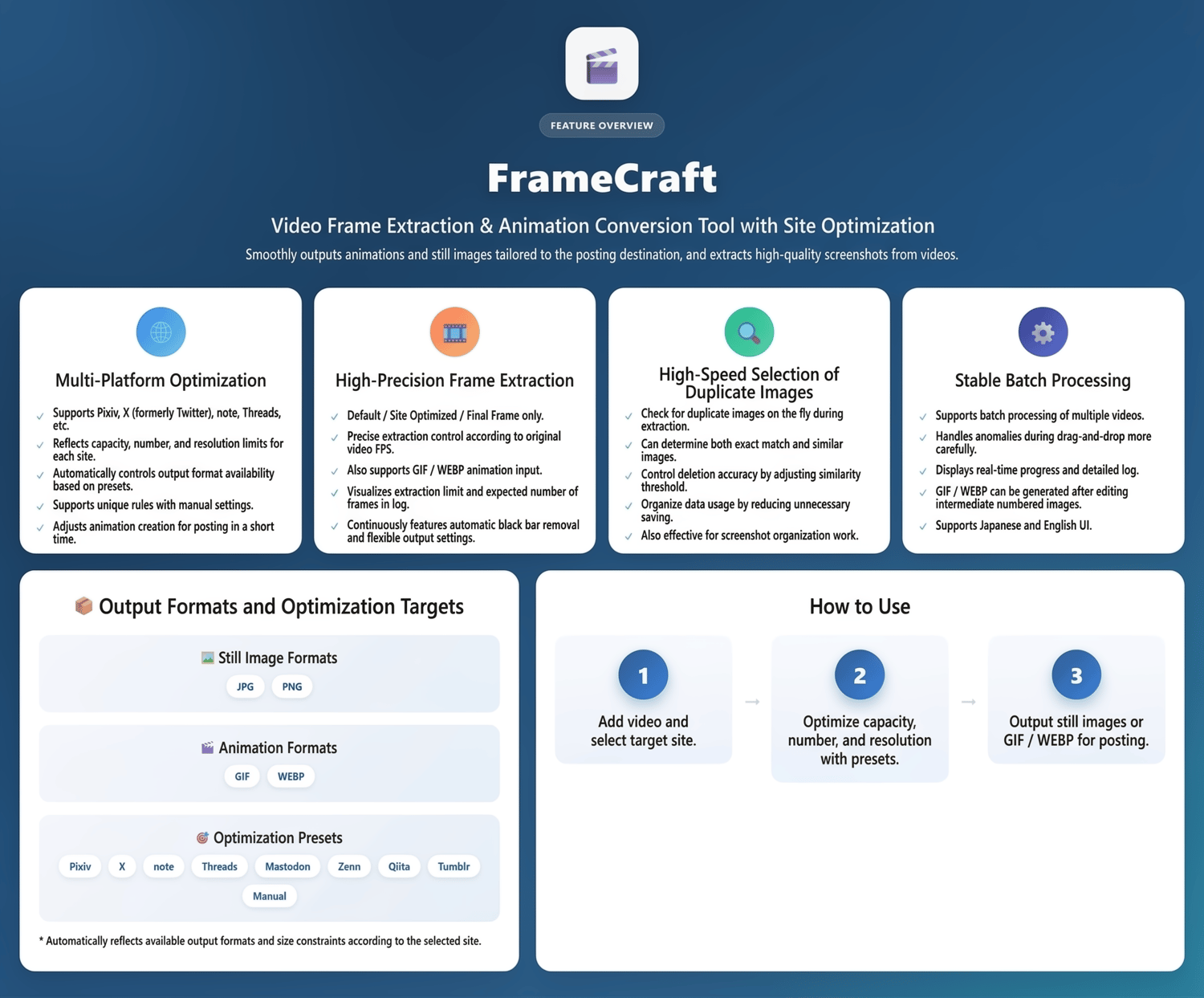 Frame Craft is a tool that lets you extract images from videos or animation files at a specified frame interval or time interval (seconds), and also convert videos into animation formats such as GIF / WEBP.