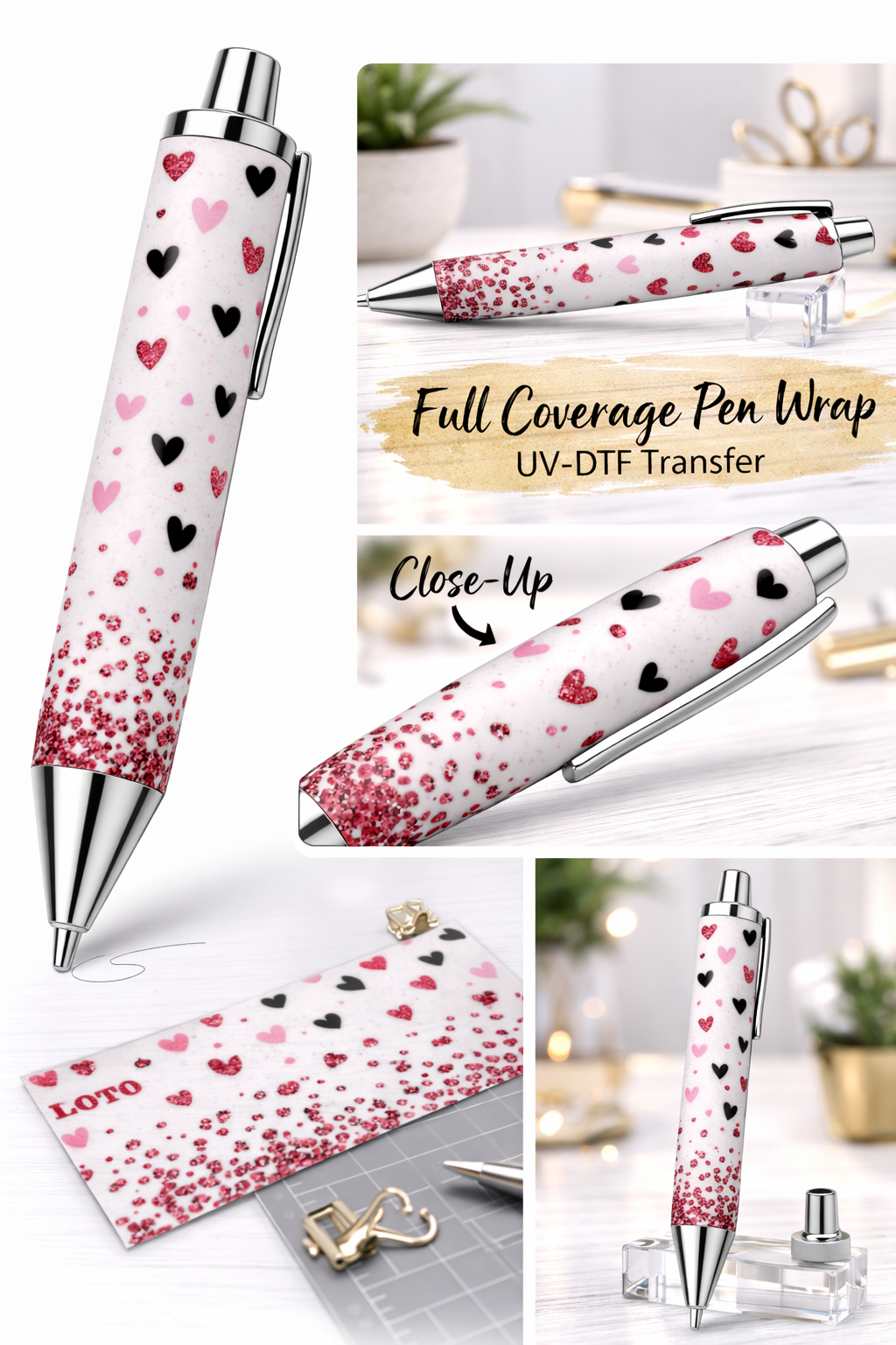 Featuring a mix of pink, black, and glitter-style hearts with a cascading confetti effect, this design blends cute and glam perfectly for standout custom pens.