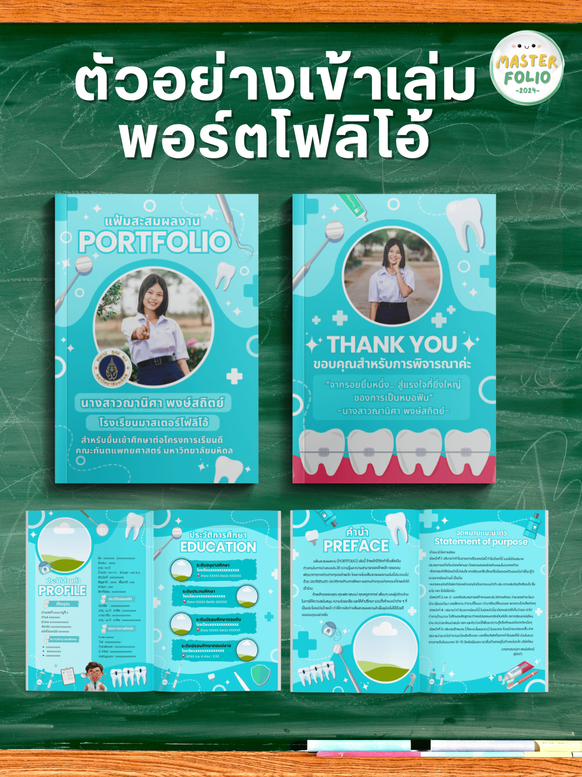 • มีโครงสร้างครบ: Preface/SOP/Contents/Profile/Education/Transcript/Activities/Certificates/Thank You
