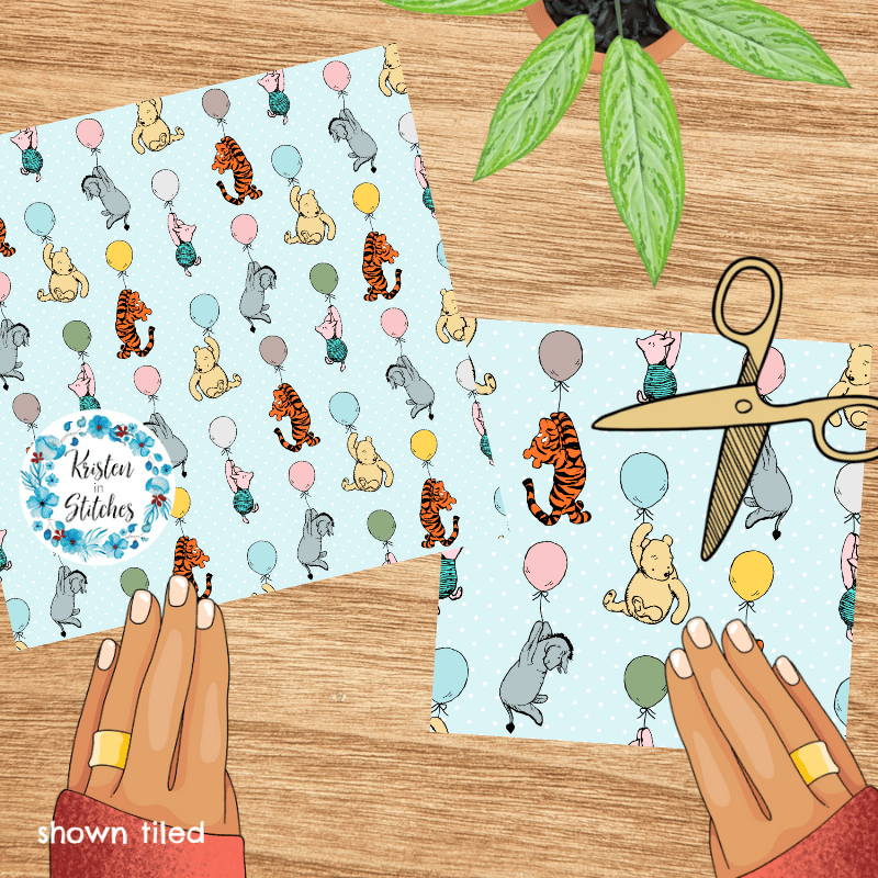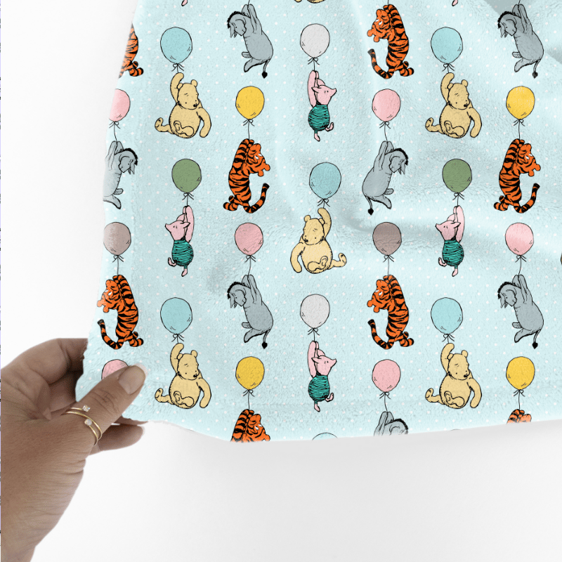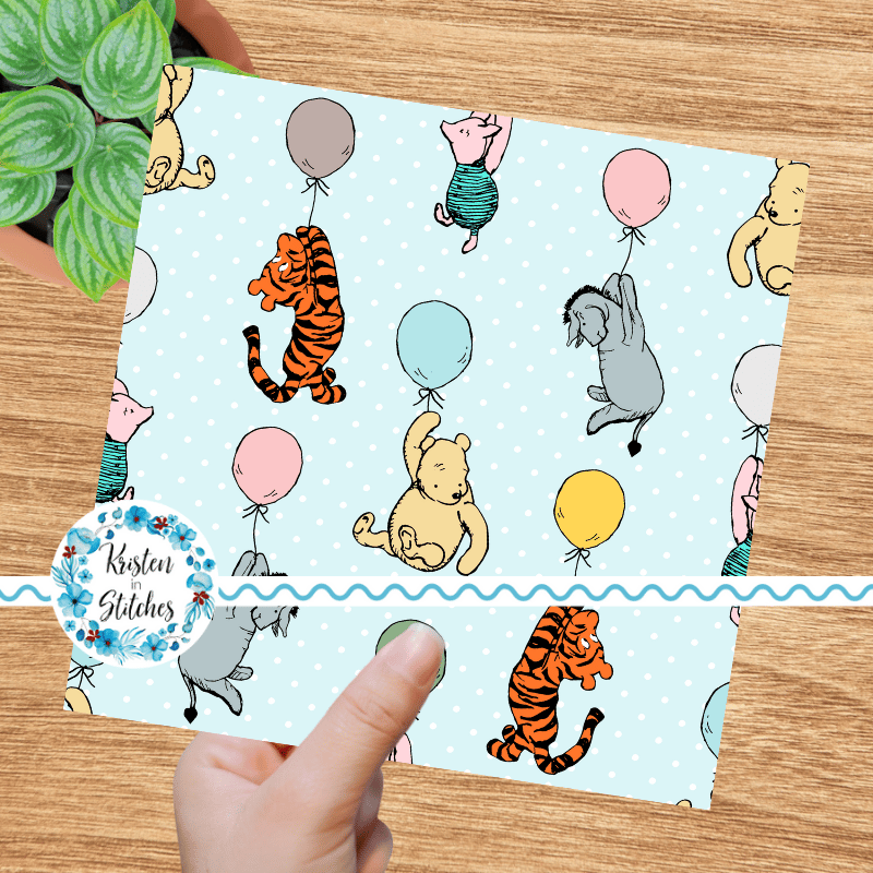 Classic Pooh storybook characters with floating balloons, including Eeyore, Tigger and Piglet.