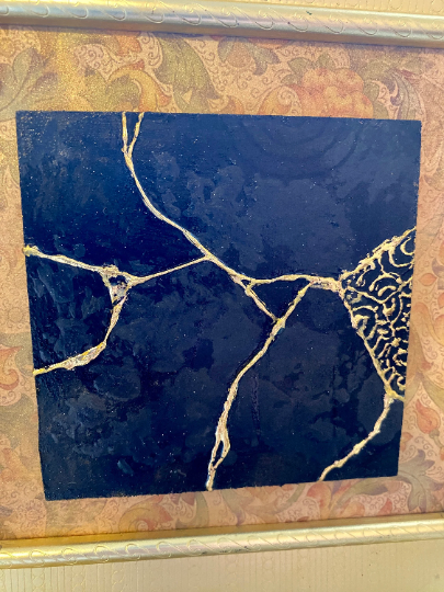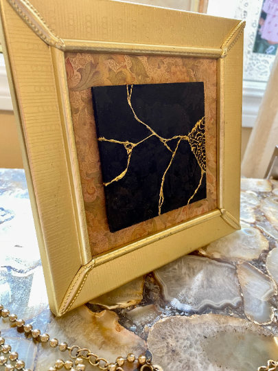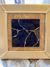 This is a hand painted faux Kintsugi tile framed with a beautiful gold frame.