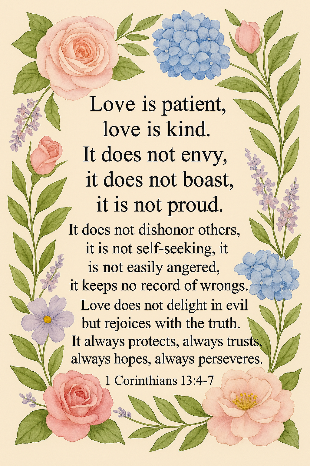 Celebrate the beauty of love with this delicately illustrated scripture from 1 Corinthians 13:4–7:
